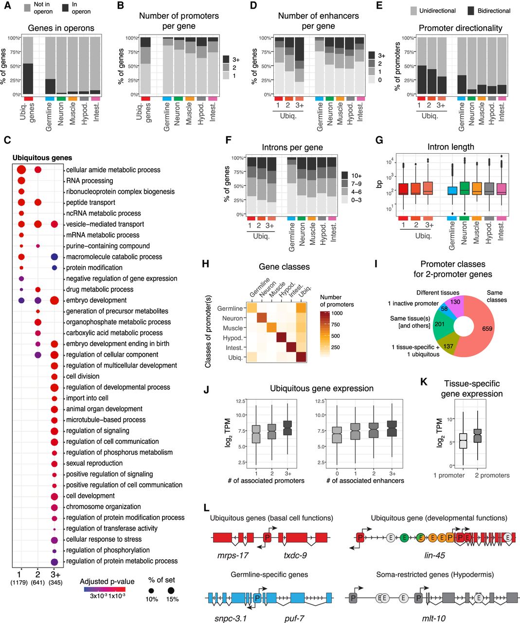 Regulatory architectures of ubiquitous, germline, and soma-restricted genes have distinctive features. (A) Percentage of genes organized in an operon for each gene class. (B) Percentage of genes with one, two, or three or more promoters for each gene class. (C) GO terms from Biological Process ontology enriched in ubiquitous genes with one, two, or three or more annotated promoters. (D) Percentage of genes with zero, one, two, or three or more enhancers associated with genes of each expression class. Only genes with at least one annotated promoter are considered. (E) Percentage of unidirectional or bidirectional protein-coding promoters for each gene class. (F) Percentage of genes with the indicated number of introns for each gene class. (G) Intron length for each gene class. (H) Classes of promoters associated with genes of each expression class. Only the major promoter classes are displayed. For all results, see Supplemental Table S2. (I) Concordance of promoter classes for genes with two promoters. (J) Gene expression levels in whole young adults for ubiquitous genes with one, two, or three or more promoters (left) or with zero, one, two, or three or more enhancers (right). (K) Gene expression levels of tissue-specific genes with one promoter or two promoters specifically active in the same tissue. In panels B through K, only first genes in operons and nonoperon genes were considered. (L, left) Examples of the simple regulatory architecture shared by ubiquitous genes and germline-specific genes. (Right) Examples of more complex architectures found at developmental ubiquitous genes (e.g., lin-45) or somatic tissue–specific genes (e.g., mlt-10).