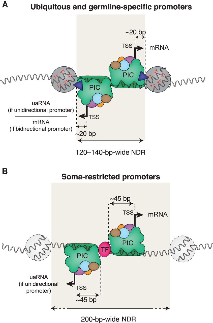 Two models of preinitiation complex (PIC) positioning at promoters. The nucleosome organization and sequences features found in ubiquitous, germline-specific, and somatic tissue–specific promoters suggest that two models of PIC recruitment exist. (A) In ubiquitous and germline-specific promoters (i.e., germline-active promoters), nucleosomes flank a narrow 120- to 140-bp-wide NDR. Positioning of these nucleosomes is facilitated by the underlying DNA sequence, which harbors highly periodic WW (mainly TT) dinucleotides. Thus, the PIC assembling at the NDR is physically constrained by the +1 nucleosome edge, resulting in transcription initiation ∼20 bp upstream of the +1 nucleosome edge. Many of these promoters lead to bidirectional elongative transcription. Otherwise, upstream-antisense RNA (uaRNA) are transcribed. (B) In soma-restricted promoters, NDRs are wider (>200 bp), and flanking nucleosomes are weakly positioned and not reproducibly aligned relative to the TSS. Core and transcription factors recruited to the NDR facilitate assembly and positioning of the PIC, resulting in transcription initiation −45 to −50 bp downstream.