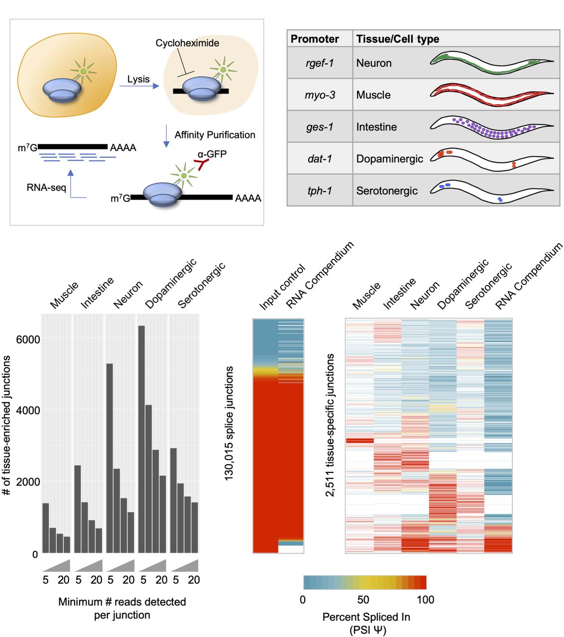TRAP-seq identifies tissue-enriched junctions not found in whole-animal data. (A) Experimental outline for TRAP-seq approach. Animals expressing a GFP-tagged ribosomal protein are lysed in the presence of cycloheximide, and lysates are immunoprecipitated with anti-GFP antibodies, enriching for ribosome-associated mRNAs. cDNA libraries are prepared and then sequenced. (B) TRAP strains used in the present study, with reference gene listed from where promoters were cloned, as well as broad tissues or neuron subtypes for which mRNA profiles were obtained using TRAP-seq. (C) Number of tissue-specific splice junctions from each TRAP-seq IP sample that are absent from our whole-animal input control transcriptomes over increasing read count support thresholds. (D, left) Comparison of our whole-animal input control transcriptome data and RNA compendium data curated by Tourasse et al. (2017). PSI values for all input junctions and corresponding RNA compendium junctions are shown in the heatmap. Pearson correlation coefficient, R = 0.91, P < 2.2 × 10−16. (Right) PSI values of alternatively spliced tissue-specific junctions with at least 20 supporting reads, and corresponding PSI values in the RNA compendium. White indicates cases in which no reads were detected in a particular sample.