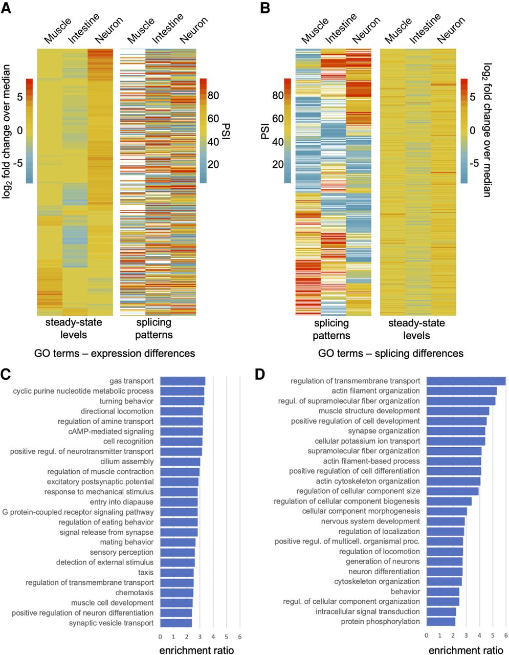 Tissue-regulated splicing and steady-state level differences are enriched in nonoverlapping gene sets. (A, left) Genes with significant steady-state transcript level differences clustered by their log2-transformed fold change over median ratios. (Right) PSI value measurements for alternative splicing events in the same genes ordered according to panel on the left. (B, left) Genes with tissue-regulated splicing patterns clustered by their respective PSI value measurements. (Right) The log2-transformed fold change over median ratios for the same genes with splicing differences, ordered according to panel on the left. (C) Gene Ontology (GO) enrichment analysis of genes with steady-state transcript level differences from heatmap in A. Overrepresentation analysis was performed applying Bonferroni correction for multiple testing. Significantly enriched biological processes with corrected P-values < 0.05 are shown. The enrichment ratio is the proportion of the number of genes in the sample set versus the number of genes in the background set for each GO category. Top 25 GO terms are listed. Full list is available in Supplemental Table S6. (D) GO enrichment analysis of genes with tissue-regulated splicing events from heatmap in B. Analysis is as described in C.