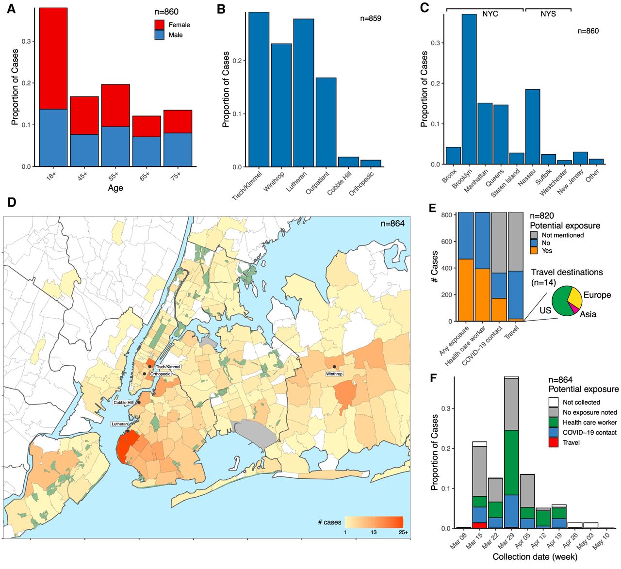 Demographic parameters of sequenced SARS-CoV-2 cases in the NYULH system. Cases are broken down as follows: (A) Age and sex; (B) collecting hospital; (C) residential location, grouped by borough and outlying counties; “Other” includes counties with few cases. (D) Localization of case residences within the New York City region. The color scale indicates number of cases per ZIP code. Collecting hospitals are labeled with rounded boxes. (E) Potential exposure status, categorized by occupation as healthcare worker, travel history, and contact with a COVID-19-positive individual. The pie chart depicts the geographical destination of the potential travel-related exposures. (F) Potential exposure status by collection date.