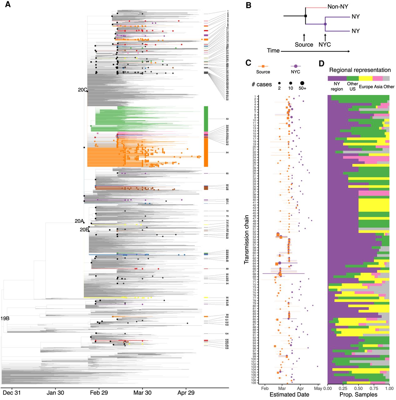 Timescaled phylogeny showing global sequence context. (A) Colored edges highlight transmission chains. Black squares indicate source nodes; dots, detected presence in the northeast United States. (B) Schematic of approach to infer introductions and transmission chains. (C,D) Transmission chains in the New York City region ordered by inferred divergence date from source. (C) Dates estimated for source transmission (orange) and earliest detected local transmission (purple) inferred from sequenced cases; lines represent 90% confidence intervals. Point size corresponds to the number of strains under source and all transmission chains. (D) Representation of global regions in each source transmission. Bar at top shows overall representation of regions in the phylogeny.