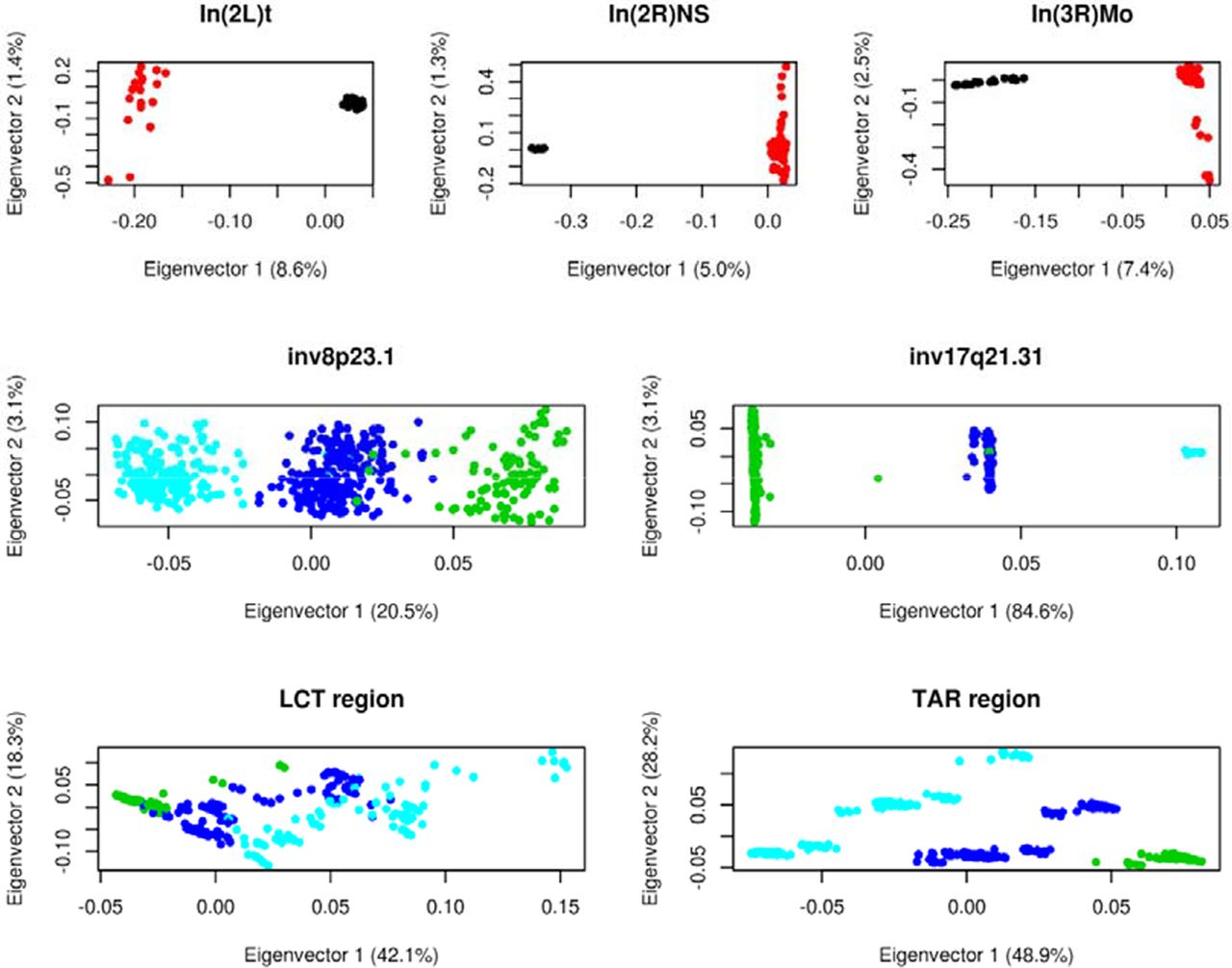 recombClust classification recovers the population structure detected by principal component analysis (PCA) of SNP data. In D. melanogaster inversions [In(2L)t, In(2R)NS, and In(3R)Mo], each point represents the first two principal components of an inbred line, colored by recombClust classification: (black) subpopulation 1; (red) subpopulation 2. In humans, each point represents the first two PCs of a diploid individual colored by the recombClust classification: (green) subpop1/subpop1; (blue) subpop1/subpop2; (cyan) subpop2/subpop2.