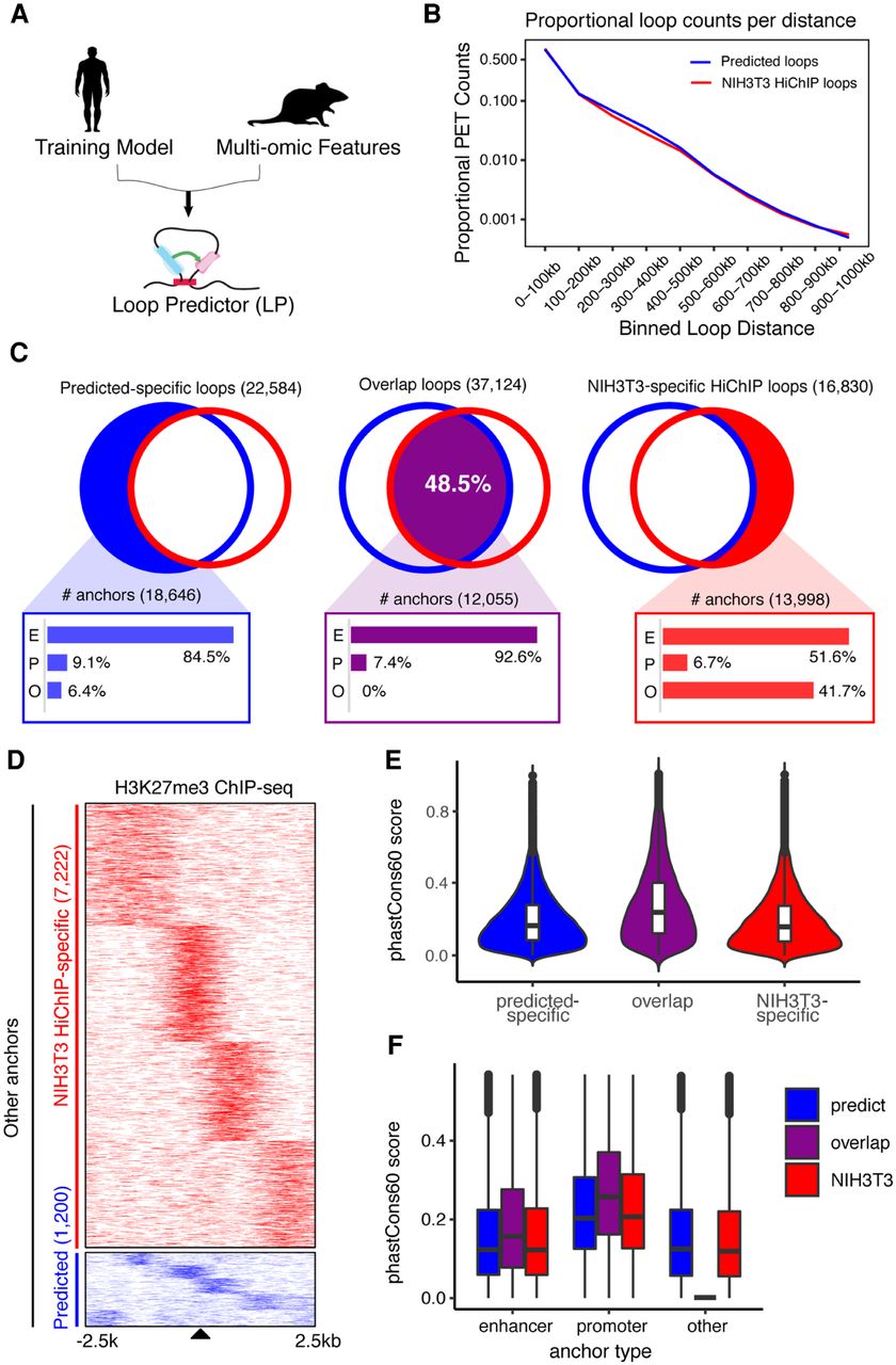 Cross-species long-range chromatin loop predictions. (A) Diagram for cross-species chromatin predictions. The adaptive training model implemented previously and trained on human cell lines was combined with multi-omics data from murine NIH3T3 myofibroblasts as input for LoopPredictor. (B) Proportional loop counts per distance for predicted and NIH3T3 HiChIP loops. Loops were binned by 100 kb to calculate the proportion. (C) Venn diagrams depicting the amounts of predicted-specific loops (22,584), overlapping loops (37,124), and NIH3T3-specific HiChIP loops (16,830). The common loops accounted for 48.5% of the total loops. The bar plots shown below indicate the composition of anchor types from each loop set. (E) Enhancer type, (P) promoter type (P), (O) other type. (D) Heat map for H3K27me3 ChIP-seq signal over O-type anchors in NIH3T3 HiChIP-specific and predicted-specific loops found in C. The number of O-type anchors in NIH3T3 HiChIP-specific and predicted-specific sets are 7222 and 1200, respectively. ChIP-seq signals were visualized across a 5-kb window. (E) Violin plots of conservation scores across anchor types. Anchor regions derived from C. (F) Boxplot for conservation scores by anchor type derived from C.