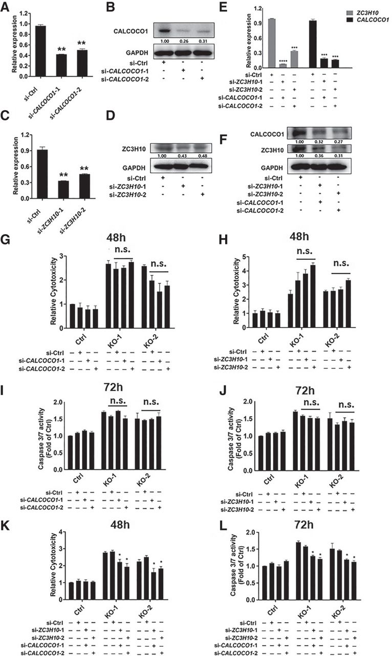 Knockdown of both CALCOCO1 and ZC3H10 rescues increased TMZ sensitivity in HOTAIR regulatory element KO glioma cells. (A) RT-qPCR verification of CALCOCO1 siRNA knockdown efficiency. Data represent means ± S.E.M. of three independent experiments. (**) P < 0.01 compared with Ctrl. (B) Western blot verification of CALCOCO1 siRNA knockdown efficiency. Relative protein levels were quantified by using ImageJ. (C) RT-qPCR verification of ZC3H10 siRNA knockdown efficiency. Data represent means ± S.E.M. of three independent experiments. (**) P < 0.01 compared with Ctrl. (D) Western blot verification of ZC3H10 siRNA knockdown efficiency. Relative protein levels were quantified by using ImageJ. (E) RT-qPCR verification of CALCOCO1 siRNA and ZC3H10 siRNA knockdown efficiency. Data represent means ± S.E.M. of three independent experiments. (***) P < 0.001, (****) P < 0.0001, compared with Ctrl. (F) Western blot verification of CALCOCO1 siRNA and ZC3H10 siRNA knockdown efficiency. Relative protein levels were quantified by using ImageJ. (G,H) LDH release was tested in control U251 glioma cells and HOTAIR regulatory element KO glioma cells transfected with control siRNAs and CALCOCO1 or ZC3H10 siRNAs. LDH release was tested after 48 h of TMZ (1 mM) treatment. Data represent means ± S.E.M. of three independent experiments. (I,J) Caspase 3/7 activities were tested in control U251 glioma cells and HOTAIR regulatory element KO glioma cells transfected with control siRNAs or CALCOCO1 or ZC3H10 siRNAs. Caspase 3/7 activities were tested after cells were treated 72 h with TMZ (1 mM). Data represent means ± S.E.M. of three independent experiments. (K) LDH release was tested in control U251 glioma cells and HOTAIR regulatory element KO glioma cells transfected with control siRNAs or CALCOCO1 and ZC3H10 siRNAs. LDH release was tested after cells were treated 48 h with TMZ (1 mM). Data represent means ± S.E.M. of three independent experiments. (*) P < 0.05 compared with corresponding Ctrl. (L) Caspase 3/7 activities were tested in control U251 glioma cells and HOTAIR regulatory element KO glioma cells transfected with control siRNAs or CALCOCO1 and ZC3H10 siRNAs. Caspase 3/7 activities were tested after cells were treated 72 h with TMZ (1 mM). Data represent means ± S.E.M. of three independent experiments. (*) P < 0.05 compared with corresponding Ctrl.