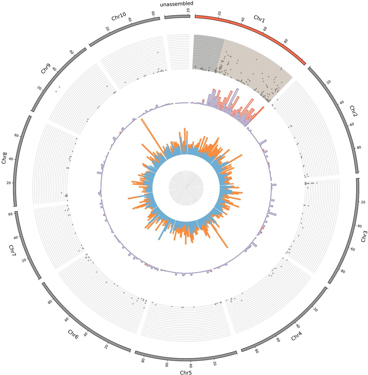 Distribution of the sex-linked and sex-biased genes onto the C. sativa reference genome. From outer to inner rings: (1) Chromosomes from 1 to 10 and unassembled scaffolds of the reference genome (Grassa et al. 2018); (2) X-Y dS values (from 0 to 0.4); (3) proportion of XY-linked genes (in blue) and X-hemizygous genes (in red) in 2-Mb windows; (4) proportion of genes with sex-biased expression in 2-Mb windows: male-biased (light blue), female-biased (orange). THCAS and CBDAS genes found in Grassa et al. (2018) are indicated by two red dots near the outer ring.