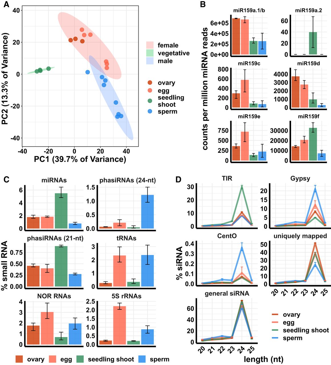 Small RNA composition of ovary, egg cell, sperm cell, and seedling shoot. (A) Principle component analysis (PCA) plot of tissues by miRNA expression pattern. (B) miRNA159 family expression. y-axis values are relative to the total number of miRNA reads in each tissue. Color code is the same as in A. (C) Small RNA compositions. y-axis values are relative to the total number of reads that mapped to the genome. (D) siRNA abundance by length and category. “siRNAs” refers to all 20- to 25-nt small RNAs that mapped to the genome but were not included in any category in C. “Uniquely mapped” refers to the subset that map with a MAPQ value of at least 20. “Gypsy” is the subset that overlaps with an annotated Gypsy element, and “TIR” is the subset that overlaps with an annotated DNA transposon of the Tc1/Mariner, PIF/Harbinger, Mutator, or hAT superfamilies. “CentO” is the subset that overlaps CentO tandem repeats. y-axis values are the number of siRNAs of each length normalized by the total number of siRNAs. In all panels, error bars are 95% confidence intervals based on biological replicates of each tissue.