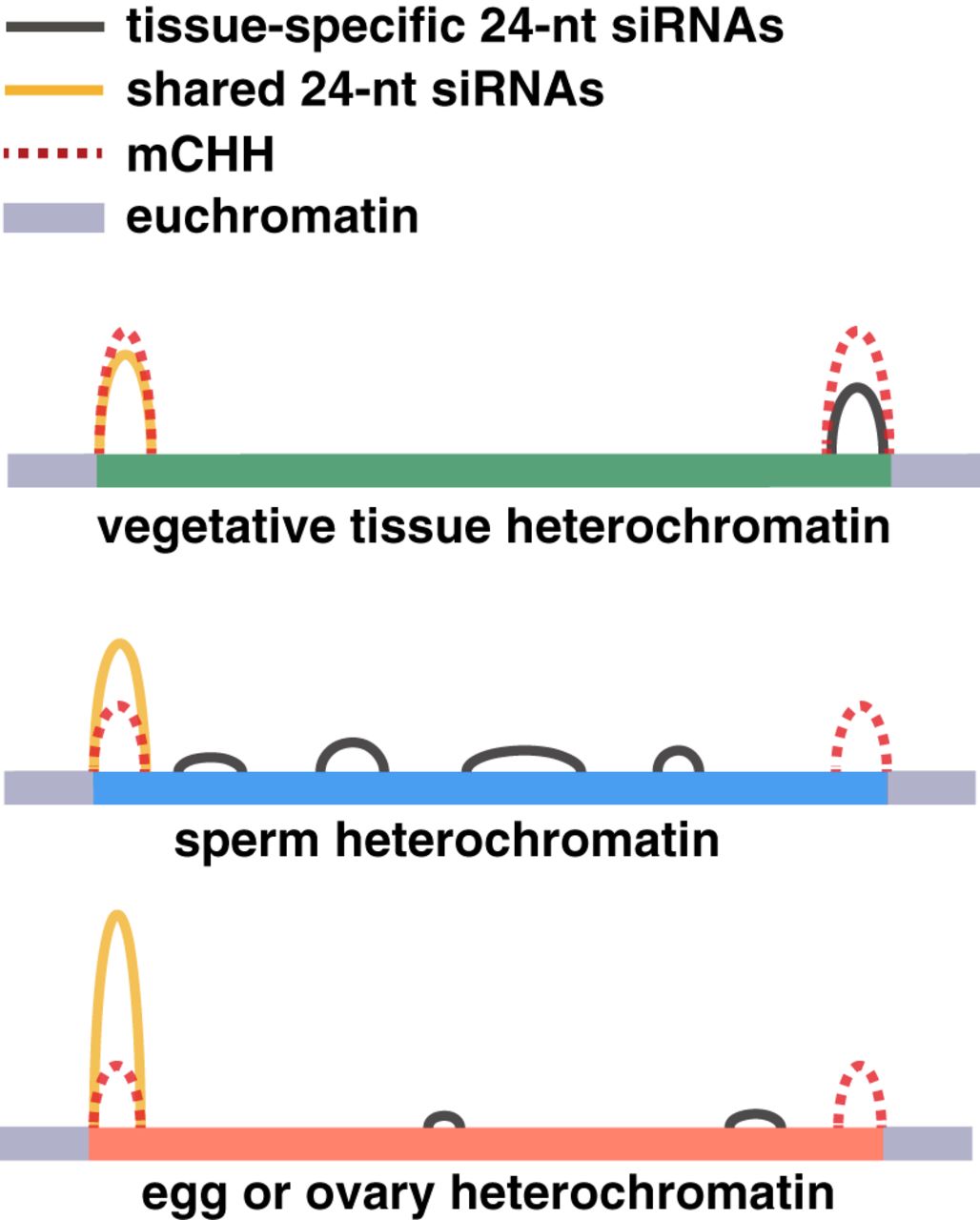 Schematic representation of 24-nt siRNAs and CHH methylation in different tissues. Gray segments represent euchromatic DNA and colored segments represent heterochromatic DNA, the same region in each tissue. Tissue-specific 24-nt siRNAs are abundant in either sperm cell, egg cell, or seedling leaf (tissue-specific loci), while shared 24-nt siRNAs are abundant in all three (intersection loci).