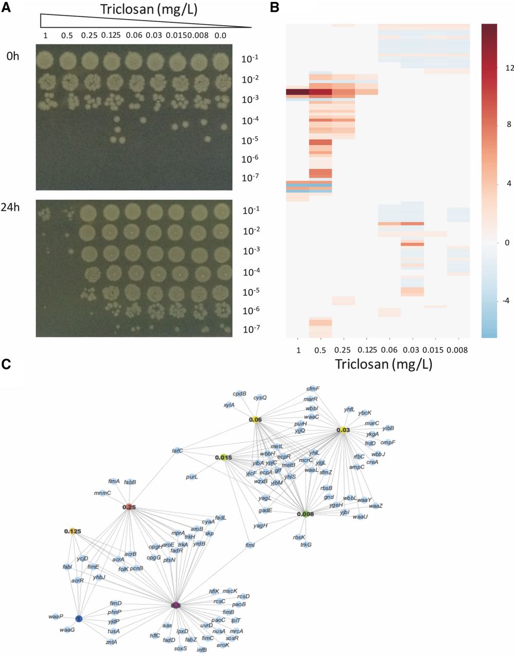Dose-dependent activity of triclosan. (A) Viability of BW25113 from LB broth cultures supplemented with different concentrations of triclosan, immediately after inoculation (top) and after incubation for 24 h (bottom). Samples from the cultures were serially diluted 10-fold, and 5 µL of all dilutions was spotted onto LB agar and incubated. The level of dilution (from 10−1 to 10−7) is shown on the right side of the photographs, and the concentrations of triclosan in the cultures are shown along the top. The results show a bactericidal effect >0.5 mg/L; triclosan at 0.25 mg/L caused a 10-fold reduction in growth over the 24-h period, but at ≤0.125 mg/L, there was no growth inhibition. (B) Heat map highlighting differences in reads mapped to genes at the different triclosan concentrations shown along the bottom of the chart. Each row represents a gene, and genes are ordered from top to bottom. The intensity scale reflecting the size of difference is shown on the right of the map. (C) Network produced by the AlbaTraDIS software illustrating the genes identified as important at different concentrations of triclosan. Nodes represent genes (blue) or triclosan concentrations (indicated by colored nodes); edges show links between conditions and genes. The similarities of responses between sub-MIC and supra-MIC exposures are clearly visible.