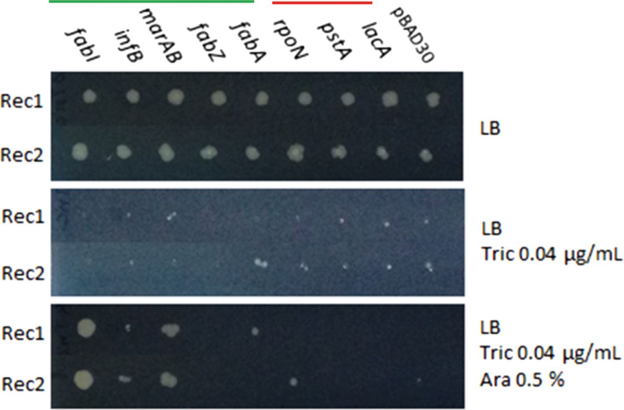 Altering expression of targets impacts triclosan sensitivity. The coding sequences of selected genes were cloned into the pBAD30 expression vector under transcriptional control of the arabinose-inducible promoter. This was to modify their expression and test the predicted impact on triclosan sensitivity. Genes fabI, infB, marAB, and fabZ were cloned in the forward orientation, allowing their up-regulation after induction (under the green bar). In contrast, fabA, rpoN, pstA, and lacA were cloned in the reverse direction, allowing inducible production of an antisense transcript and consequent repression of expression (under the red bar). The lacA and pBAD30 vector alone constructs were included as negative controls. Duplicate recombinants (Rec1, Rec2) for each gene were tested by spotting cultures onto LB-agar (top), LB agar supplemented with 0.04 µg/mL triclosan (middle), or LB agar supplemented with 0.04 µg/mL triclosan and 0.5% arabinose. All recombinants grew without selection, and none grew in the presence of triclosan without arabinose. With triclosan and arabinose induction, the fabI, infB, and marAB recombinants consistently grew better than the controls.