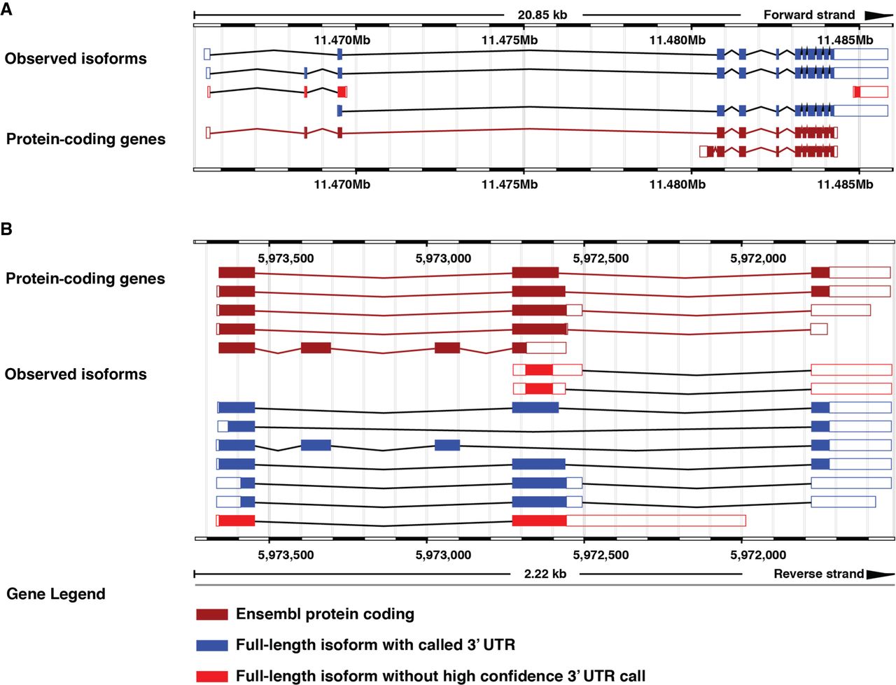 Examples highlighting the utility of our custom track hub. The lin-14 (A), or mlp-1 (B) locus in the Ensembl Genome Browser including our custom track hub. Blue isoforms are full-length isoforms with an associated 3′ UTR called; red isoforms have no high-confidence 3′ UTR called. Burgundy isoforms are protein-coding models imported from WormBase.