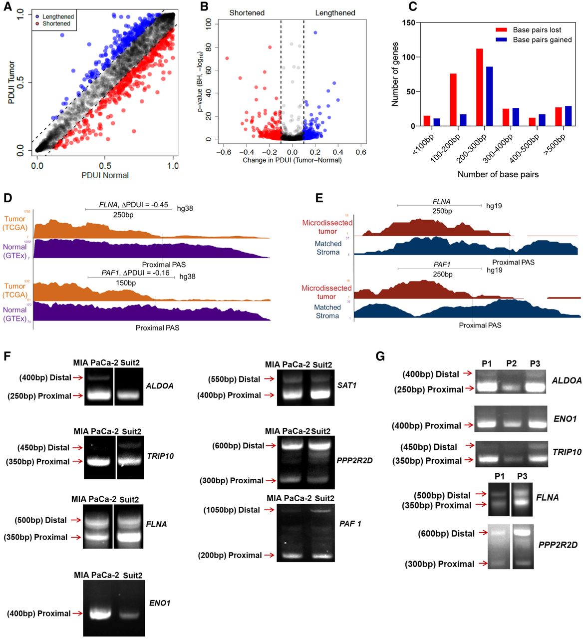 Integrative analysis of RNA-seq data identifies 3′-UTR alterations associated with PDAC. (A) A plot of PDUI score of each gene in human tumor and normal samples. Dashed lines represent 0.1 cutoffs. Blue dots represent 3′-UTR-lengthened genes, and red dots represent 3′-UTR-shortened genes. (B) A volcano plot denoting 3′-UTR-shortened (red) and -lengthened (blue) gene hits (FDR < 0.01) whose |ΔPDUI| > 0.1. (C) A plot showing the number of base pairs lost/gained by 3′-UTR-altered genes. (D) UCSC Genome Browser plot depicting the 3′-UTR RNA-seq density profile of two 3′-UTR-shortened genes (FLNA and PAF1) to highlight the coverage differences between tumor (orange) and normal (purple) patient samples. (E) UCSC Genome Browser plot highlighting the 3′-UTR profile differences between FLNA and PAF1 in a microdissected data set in patient tumor (red) and stroma (blue). (F) 3′ RACE of altered PDAC-associated genes in MIA PaCa-2 and Suit2 cells (representative images, n = 3). Approximate length of the 3′-UTR form is denoted beside each band. (G) 3′ RACE of select genes in primary patient samples (P1, P2, P3).
