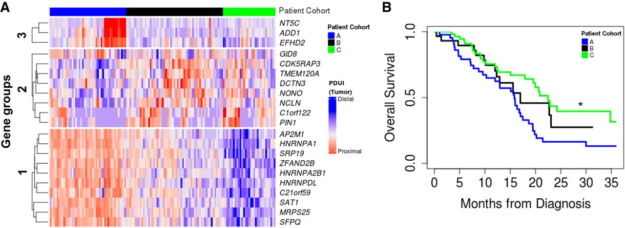 APA events identify a poor prognostic cohort in PDAC patients. (A) Patients were clustered based on 3′-UTR short (red) and long forms (blue) of 3′-UTR-altered genes (clustered into gene Groups 1, 2, and 3) and segregated into patient Cohort A (blue), patient Cohort B (black), and patient Cohort C (green). (B) Kaplan–Meier survival plot for patient Cohort A (blue), patient Cohort B (black), and patient Cohort C (green): (*) P < 0.05.