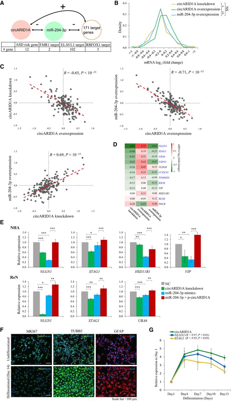 Experimental validation of the circARID1A regulatory role of miR-204-3p sponges and the corresponding circRNA-miRNA-mRNA regulatory interactions. (A) Schematic diagram representing the circARID1A-miR-204-3p regulatory axis and its corresponding targets (171 genes, including 12 ASD risk genes, two FMR1 targets, 102 ELAVL1 targets, and five RBFOX1 targets). (B–D) Microarray analysis of the target mRNA log2(fold change) in response to circARID1A knockdown, circARID1A overexpression, and miR-204-3p overexpression, respectively. (B) Distribution of the target mRNA log2(fold change) in response to circARID1A knockdown, circARID1A overexpression, and miR-204-3p overexpression. P-values are determined using one-tailed (circARID1A knockdown vs. circARID1A overexpression and circARID1A overexpression vs. miR-204-3p overexpression) or two-tailed (circARID1A knockdown vs. miR-204-3p overexpression) t-test. Significance: (*) P-value < 0.05; (**) P-value < 0.01; (NS) not significant. (C) The correlations between mRNA fold changes after circARID1A knockdown, circARID1A overexpression, and miR-204-3p overexpression. The Pearson correlation coefficient (R) and P-value are shown. (D) Heat map of the 12 ASD risk mRNA log2(fold change) in response to circARID1A knockdown, circARID1A overexpression, and miR-204-3p overexpression, respectively. The gene symbols highlighted in blue represent that the genes are also ELAVL1 targets. (E) qRT-PCR analyses of ASD risk gene expression in NHAs (top) and hNPCs (ReN cells) (bottom) after circARID1A knockdown, miR-204-3p mimics, and miR-204-3p mimics with circARID1A expression vector (p-circARID1A), respectively. (NC) Negative control. P-values are determined using two-tailed t-test. Significance: (*) P-value < 0.05; (**) P-value < 0.01; (***) P-value < 0.001. (F) Imaging of immunostained ReN cells after 2 wk of differentiation. Immunostaining shows undifferentiated (top) and differentiated (bottom) ReN cells with the cell proliferation marker MKI67 (left), the neuronal marker TUBB3 (middle), and the mature glial cell marker GFAP (right). Nuclei are stained with DAPI (blue). (Scale bar) 100 μm; (GFAP) glial fibrillary acidic protein. (G) Relative expression of circARID1A and two ASD risk genes (NLGN1 and STAG1) during hNPC differentiation. The Pearson correlation coefficients (R) between the expression of circARID1A and the two ASD risk genes and P-values are shown in parentheses. All the qRT-PCR data are the means ±SD of three experiments.