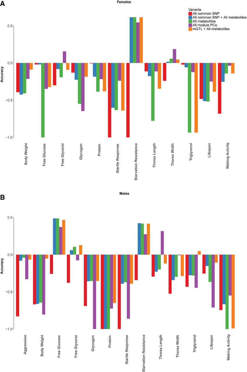 Comparisons of prediction accuracy using genome-wide SNPs with MAF > 0.05, all variable metabolites, common SNPs, and variable metabolites, all module PCs, SNPs associated with variable metabolites or module PCs (mQTLs), and metabolites for females (A) and males (B).