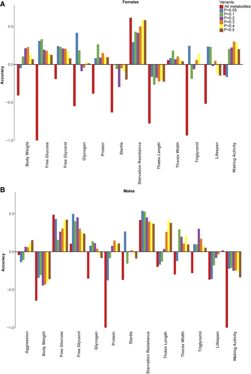 Comparisons of prediction accuracy using all variable metabolites or metabolites enriched for association with particular traits at P-values of 0.05, 0.1, 0.2, 0.3, 0.4, and 0.5, for females (A) and males (B).