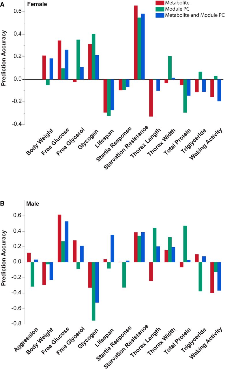 Metabolome-based predictions of organismal traits for females (A) and males (B). We used the elastic net regularization and leave-one-out cross-validation to enrich metabolites and predict phenotypic values. Prediction accuracy is estimated as the correlation between predicted and actual values. The blue, red, and green bars, respectively, represent models with training sets of metabolites and module PCs combined, or metabolites and PCs separately.