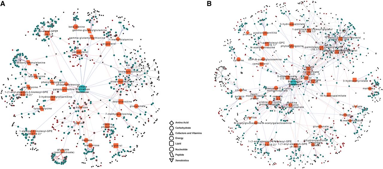 Integrated networks that incorporate polymorphic markers, variation in candidate gene expression, and variation in metabolite abundances associated with variation in starvation resistance for females (A) and males (B). Orange nodes indicate metabolites correlated with starvation resistance and teal nodes indicate candidate genes correlated with these metabolites. Black nodes indicate mQTL associated with candidate genes. Nodes with red borders indicate a direct association with the organismal phenotype. The different shapes of the orange nodes indicate different metabolic super pathways. Red edges indicate positive correlations, while blue edges represent negative correlations. Black edges connect polymorphic markers with their associated genes. The polymorphic markers, candidate genes, and metabolites presented in the figure are listed in Supplemental Table S12.