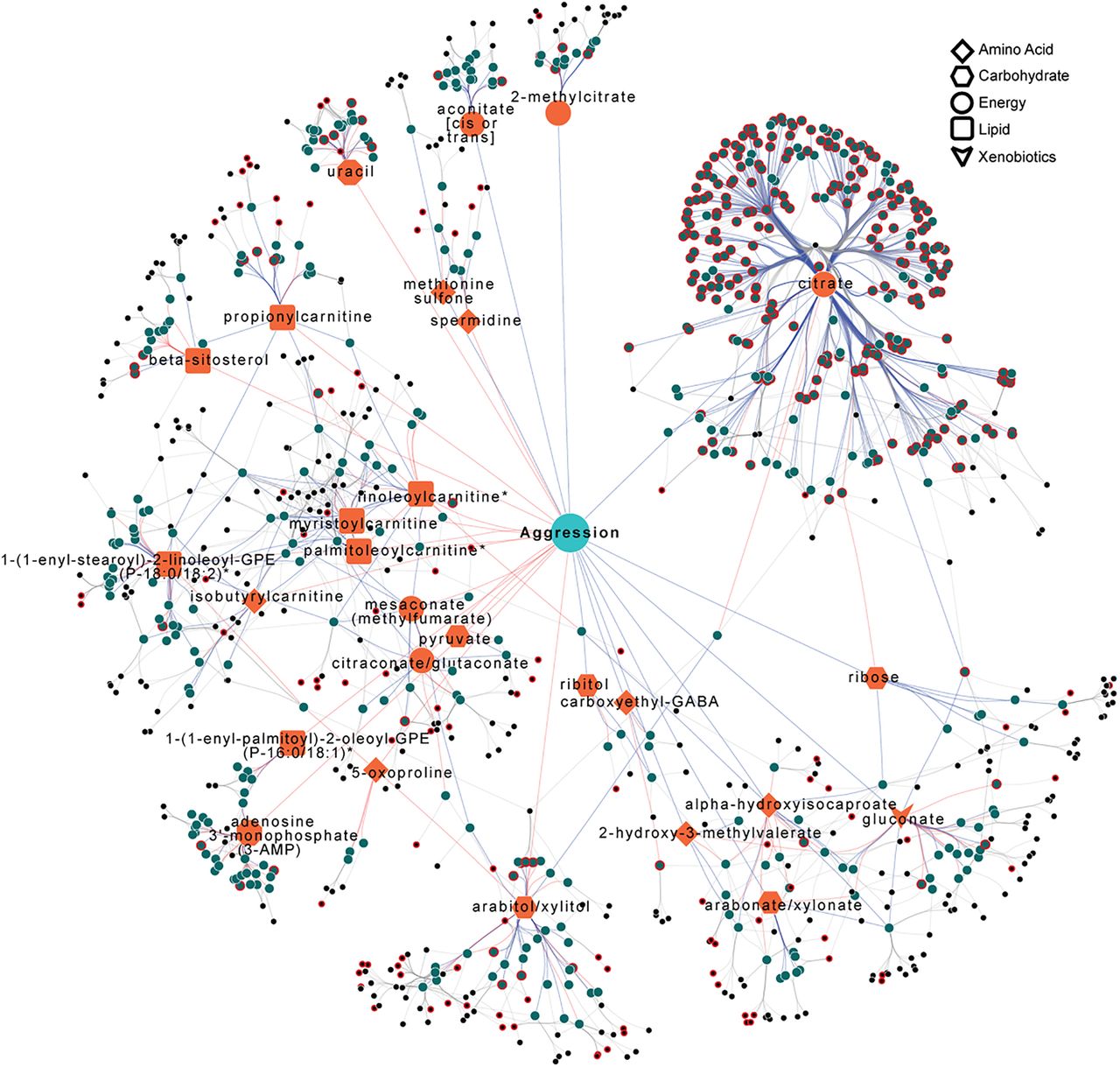 Integrated network that incorporates polymorphic markers, variation in candidate gene expression, and variation in metabolite abundances associated with variation in male aggression. Orange nodes indicate metabolites correlated with aggression and teal nodes indicate candidate genes correlated with these metabolites. Black nodes indicate mQTLs associated with candidate genes. Nodes with red borders indicate a direct association with the organismal phenotype. The different shapes of the orange nodes indicate different metabolic super pathways. Red edges indicate positive correlations, while blue edges represent negative correlations. Black edges connect polymorphic markers with their associated genes. The polymorphic markers, candidate genes, and metabolites presented in the figure are listed in Supplemental Table S12.