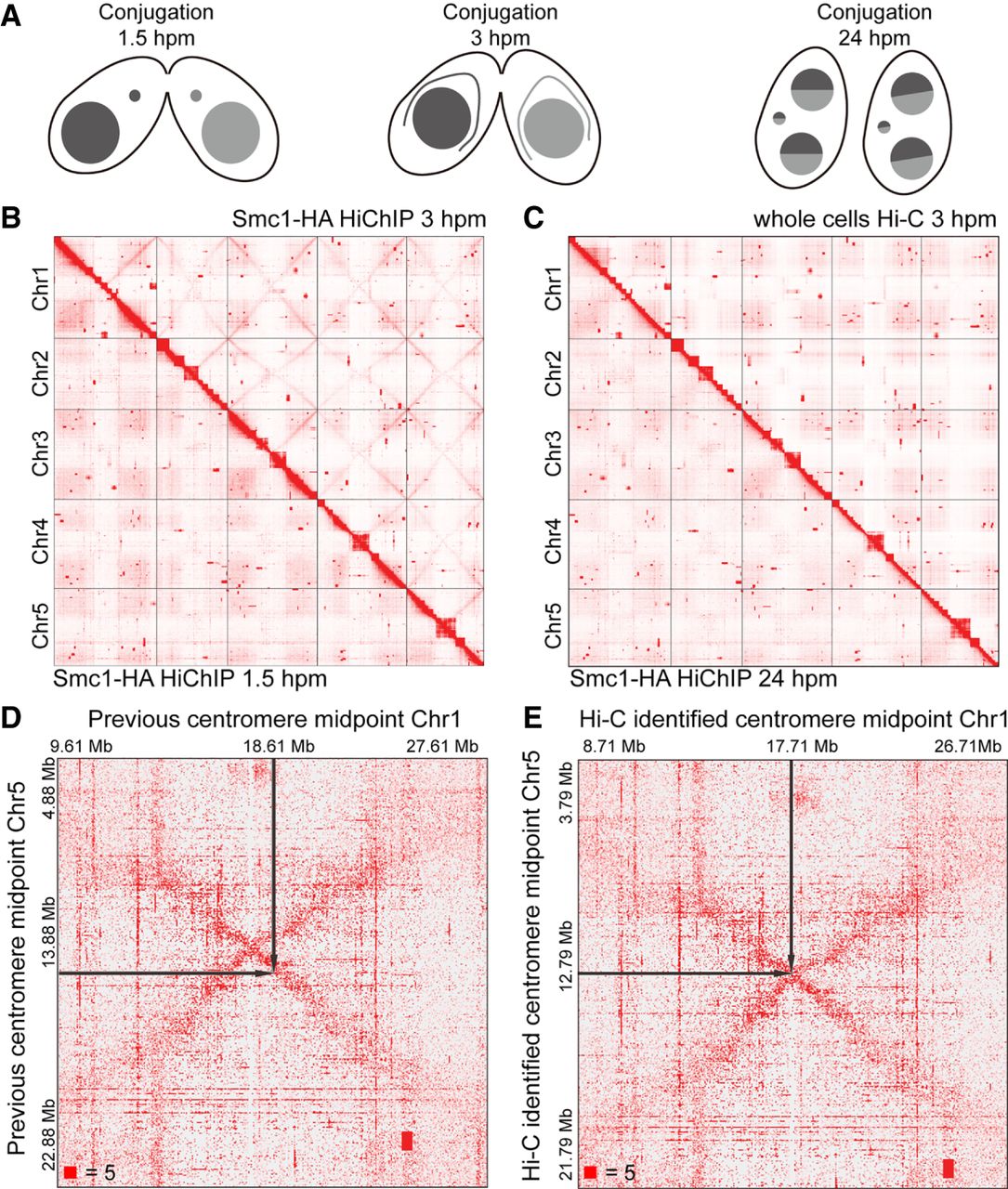Crescent-specific interactions in the MIC of T. thermophila. (A) The schematic diagram of three different stages of T. thermophila during conjugation: 1.5 hpm, 3 hpm, and 24 hpm. (hpm) Hours post-mixing. (B) The heatmaps showing the genome-wide chromosome interactions on the MIC genome at 3 hpm (Smc1-HA HiChIP data, upper right) and 1.5 hpm (Smc1-HA HiChIP data, lower left). (C) The heatmaps showing the genome-wide chromosome interactions on the MIC genome at 3 hpm (whole cells Hi-C data, upper right) and 24 hpm (Smc1-HA HiChIP data, lower left). (D,E) The heatmaps showing the MIC inter-chromosome interactions between Chromosomes 1 and 5 at 3 hpm, either defined by a previous method (D) or by our Hi-C data (E). The black arrows on the heatmaps pointed to the midpoints of centromeres. Numbers at the lower left of heatmaps corresponded to the maximum signal in the matrix.