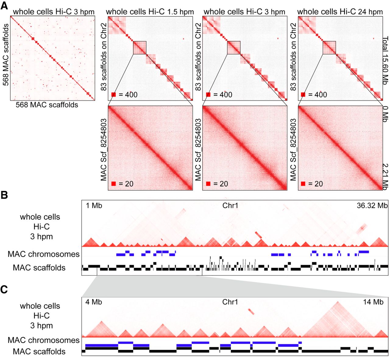 The square-shaped interaction patterns in the MAC of T. thermophila are chromosome territories. (A) Heatmaps showing the chromosome interactions on the 568 MAC scaffolds (ordered by their locations on the MIC genome) at 3 hpm (whole cells Hi-C data mapped to the MAC scaffolds), and the chromosome interactions of the 83 MAC scaffolds located on the MIC Chromosome 2 at 1.5 hpm, 3 hpm, and 24 hpm. Zoomed-in views of scf_8254803 are shown at the bottom. (hpm) Hours post-mixing. Numbers at the lower left of heatmaps correspond to the maximum signal in the matrix. (B,C) The MAC chromosomes (MAC scaffolds with telomere sequences at both ends) and the MAC scaffolds compared to the chromosome interactions on MIC Chromosome 1 at 3 hpm are shown (whole cells Hi-C data mapped to the MIC genome). Regions from 1 Mb to 36.32 Mb (B); zoomed in region from 4 Mb to 14 Mb (C).