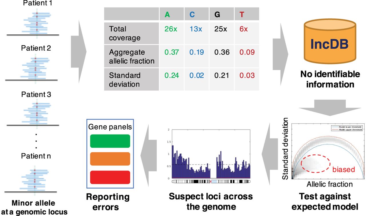 Approach for detecting loci with systematic sequence bias: Alternative allele fractions are collected from a cohort of individuals at every locus and aggregated into allele-specific summary statistics. These aggregate allelic fractions and standard deviations at each genomic position are stored in the Incremental Database (IncDB), which does not contain any patient-specific information. The 99.9% confidence interval for expected standard deviation at each allelic fraction was generated. Genomic positions where the observed standard deviation was below the confidence interval expected were cataloged as “suspect loci” and mapped to variant calls in clinically relevant genes. Prioritization of genes for diagnostic and reporting purposes can be adjusted according to the presence of suspect loci.