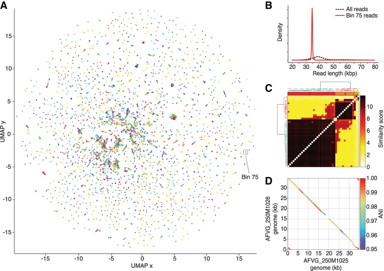 Phage discovery steps for 250-m sample. (A) Nanopore reads that were found to contain DTRs were first represented by 5-mer count vectors and dimensionally reduced into a 2D embedding using UMAP (McInnes et al. 2018). Reads in the 2D embedding are colored based on their assignment to the 2386 5-mer bins called by hdbscan (McInnes et al. 2017). 5-mer bin colors are redundant owing to the large number of bins. Reads not assigned to a bin are colored gray. The 5-mer bin 75 is highlighted and contains 42 nanopore reads. (B) Read lengths from bin 75 were compared with read lengths from all bins, revealing an enrichment of ∼35-kb reads and a depletion of reads at other lengths. (C) Reads within bin 75 were aligned to each other to generate pairwise alignment scores, which were hierarchically clustered to reveal two main alignment clusters. A polished assembly-free virus genome (AFVG) was generated from each cluster: AFVG_250M1025 and AFVG_250M1026. (D) Comparison between the AFVG_250M1025 and AFVG_250M1026 sequences shows microdiversity between the two polished phage genomes. The genomes share large regions of varying degrees of sequence identity >95% with interspersed divergent sequence.