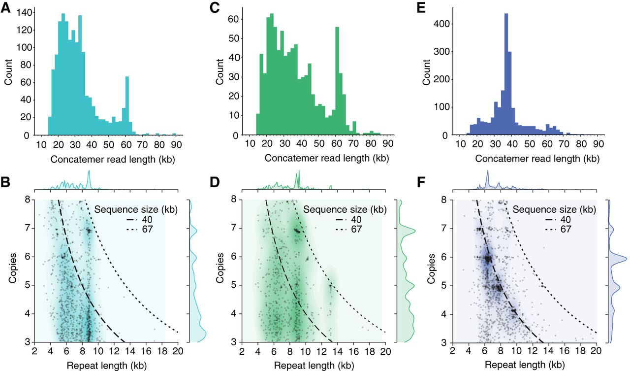 Read lengths and repeat counts in concatemeric nanopore reads. The length distribution of concatemeric nanopore reads is similar to the length distributions of polished AFVGs obtained from each sample (Supplemental Fig. S6). (A) Concatemeric reads obtained from the 25-m sample are predominately 20–40 kb with an additional enrichment for 60-kb reads. (B) In the 25-m sample, the length of the repeated unit in each concatemer and its associated repeat count. The repeat counts are enriched for whole integer values, primarily six and seven copies. Dashed lines indicate the sequence size associated with a given repeat unit count and length. (C) Concatemeric reads isolated from the 117-m sample show an enrichment in concatemer read lengths between 60 and 65 kb, which is similar in size to many of the complete phage genomes obtained from the 117-m sample. (D) The repeat unit counts are enriched at whole integer numbers, most prominently at five, six, or seven copies in the 117-m sample. Concatemers enriched for these counts in the 117-m sample are mostly associated with 60- to 65-kb concatemer reads. (E) Concatemer reads from the 250-m sample are predominantly between 35 and 40 kb in length. (F) The concatemer repeat unit counts in the 250-m sample are enriched at four, five, six, and seven whole copies. Given each specific combination of repeat unit count and length, the majority of concatemer reads remain just short of 40 kb.