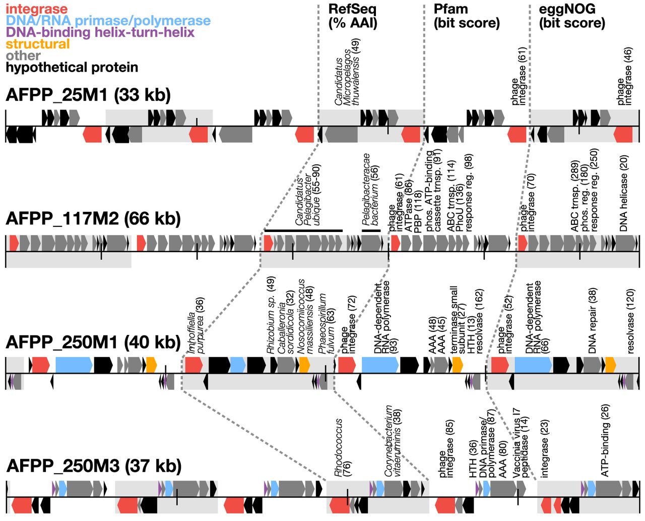 Structure of putative phage-packaged, PICI-like concatemers. Protein annotations from four representative concatemeric sequences recovered from the 250-m sample are shown. Background shading represents repetitive regions in the PICI-like concatemers. Protein-coding sequences are color-coded based on functional annotations on Pfam (bit score >30) (El-Gebali et al. 2019). Taxonomic annotations are shown with top hit to organism of RefSeq release 92 (O'Leary et al. 2016), amino acid identity (AAI), and bit score. Functional annotations are shown with top hits and bit scores to protein domains in Pfam and eggNOG (Huerta-Cepas et al. 2016).
