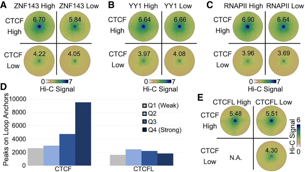 Contribution of transcription factors to CTCF loops. (A–C) SIPMeta bullseye plots for loops with either high or low CTCF ChIP-seq signal on both anchors and either high or low ZNF143 (A), YY1 (B), or RNAPII (C) ChIP-seq signal on both anchors. Scores represent average distance-normalized Hi-C signal of the loop at the center of the bullseye plot. (D) Number ChIP-seq peaks for each strength quartile that overlaps loop anchors in K562 cells. (E) SIPMeta bullseye plots for loops with either high or low CTCF and CTCFL ChIP-seq signal on both anchors. (N.A.) An insufficient number of unambiguous loops in this category. Scores represent average distance-normalized Hi-C signal of the loop at the center of the bullseye plot.