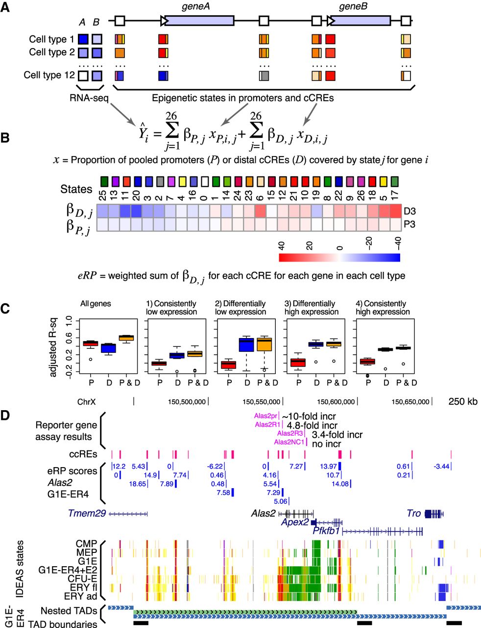 Initial estimates of regulatory output and target gene prediction using regression models of IDEAS states in promoters and cCREs versus gene expression. (A) Illustration of promoters and cCREs around two potential target genes, showing expression profiles of the genes across cell types (shades of blue; left) and promoters/cCREs with one or more epigenetic states assigned in each cell type. (B) Multivariate linear regression of proportion of promoters and pooled cCREs in each state against expression levels of potential target genes, keeping promoters and cCREs separate and learning the regression coefficients iteratively in a subselection strategy. Values of the regression coefficients’ beta for each epigenetic state for promoters and cCREs for differentially expressed genes. The values of the regression coefficients for each epigenetic state are presented as a blue-to-red heatmap. (C) Ability of eRP scores of cCREs to explain levels of expression on Chr 1–Chr 19 and Chr X in the 12 cell types for all genes and in the four categories of genes (1–4). A leave-one-out strategy was used to calculate the accuracy predicting expression. The distributions of adjusted r2 values are shown as box-plots for promoters, distal cCREs, and combined. (D) Illustration of eRP scores for cCREs in and around the Alas2 gene, including a comparison with previously measured enhancer and promoter activities. Nested TADs called by OnTAD (An et al. 2019) are shown in the bottom tracks.