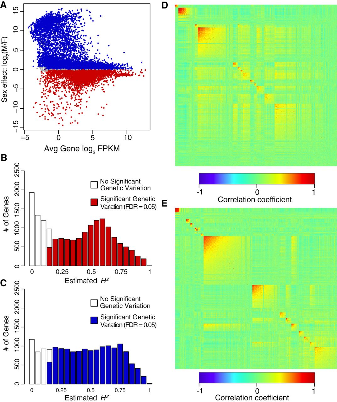 Genetic variation of gene expression in the DGRP. (A) Sexual dimorphism of gene expression. Red indicates significant up-regulation in females; blue, in males. (B) Distribution of H2 estimates for annotated genes and NTRs in females. (C) Distribution of H2 estimates for annotated genes and NTRs in males. (D) WGCNA modules for annotated genes and NTRs in females. (E) WGCNA modules for annotated genes and NTRs in males. Heatmaps show the pairwise correlation of all genes in each module, sorted by average connectivity, with the most tightly connected module at the top left.