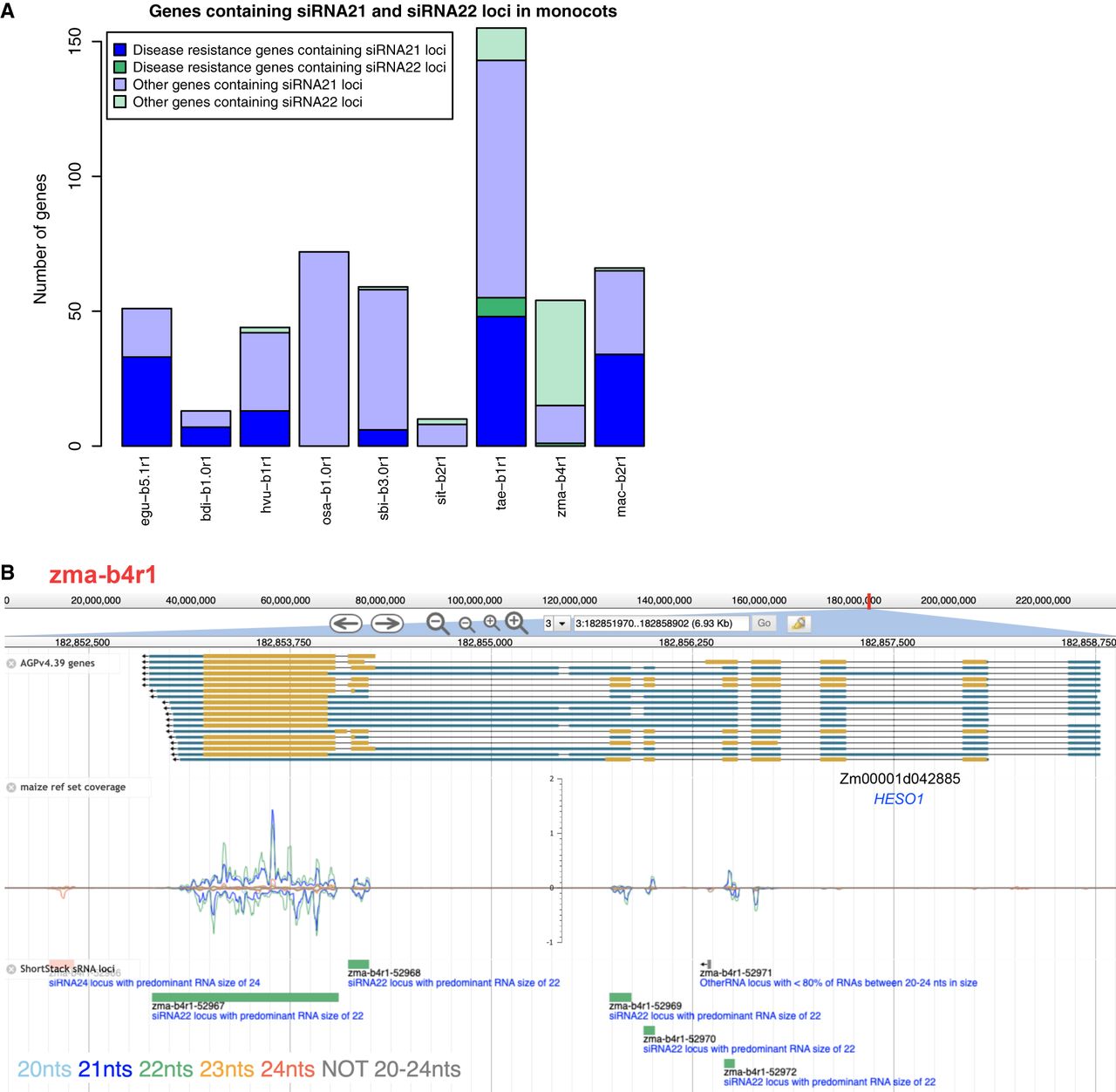 Genes containing siRNA21 and siRNA22 loci in nine monocot species. (A) Counts of genes containing siRNA21 and siRNA22 loci in monocots. (B) Screenshot of genome browser for maize HESO1 (Zm00001d042885). (Top row) mRNA structure: blue blocks for UTRs, yellow blocks for CDS, and black lines for introns. (Middle row) sRNA-seq coverage from the reference set across the gene. (Bottom row) ShortStack sRNA loci annotation.