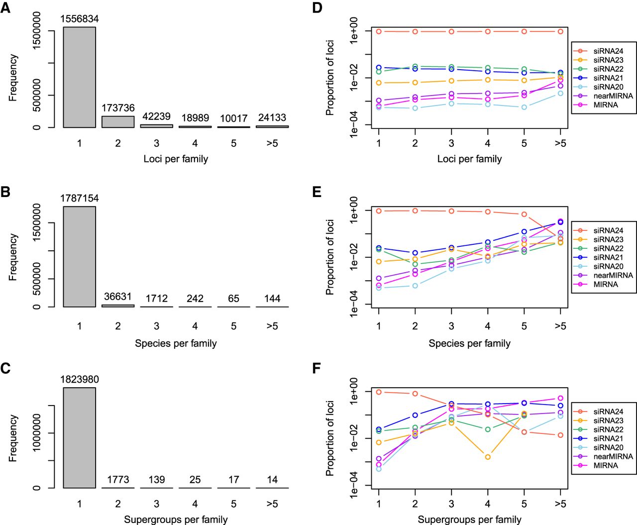 Conservation of sRNA loci in plants. (A) Frequency distribution of number of sRNA loci per putative sRNA family. (B) Frequency distribution of number of distinct plant species per putative sRNA family. (C) Frequency distribution of number of plant “supergroups” per putative sRNA family. The supergroups defined in this study are rosids, asterids, other eudicots, monocots, basal angiosperms, gymnosperms, and bryophytes. (D) Proportions of types by number of loci per putative sRNA family. (E) Proportions of types by number of distinct plant species per putative sRNA family. (F) Proportions of types by number of plant “supergroups” per putative sRNA family.