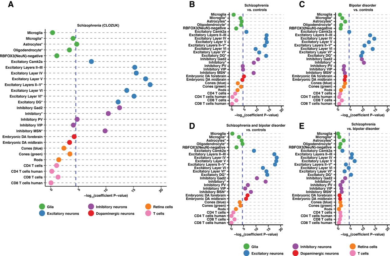S-LDSC results for CLOZUK and PGC schizophrenia studies as well as bipolar disorder GWAS reveal excitatory cortical neuron enrichment. (A–E) Dotplots displaying the −log10(heritability coefficient P-values) S-LDSC results for: (A) CLOZUK schizophrenia GWAS, (B) PGC schizophrenia GWAS, (C) PGC bipolar disorder GWAS, (D) schizophrenia and bipolar disorder GWAS, and (E) PGC schizophrenia versus bipolar disorder GWAS. Across trait significance levels are shown (−log10[coefficient P-values] = 4.53857; blue dashed line). Populations are colored and ordered by broader cell-type category. Asterisks in the cell population name indicate single-nuclei ATAC-seq data. All results can be found in Supplemental Table S6.