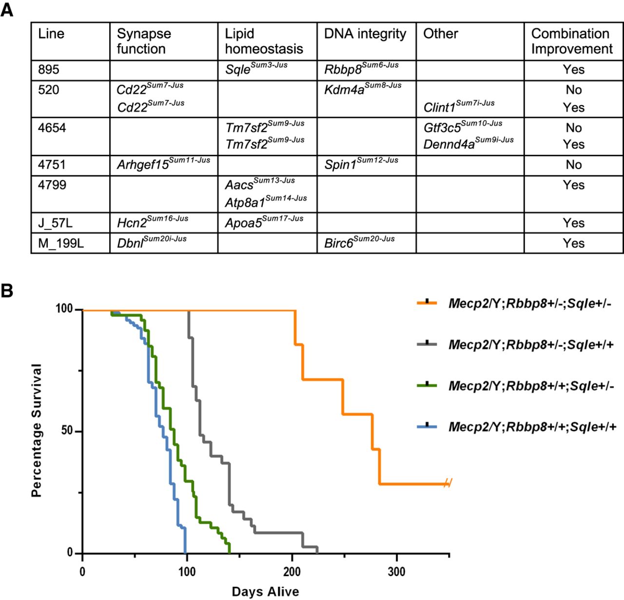 Combinatorial effects of multiple mutations on health and longevity. (A) Multiple lines (895, 520, 4654, 4751, 4799, J_57L, and M_199L) carry lesions in more than one gene that either independently or additively improve health. Kdm4a and Cd22 in line 520, Tm7sf2 and Gtf3c5 in line 4654, and Arhgef15 and Spin1 in line 4751 show independent effects on health, whereas the other mutations show positive combinatorial effects on Mecp2/Y health. (B) Mecp2/Y mice from line 895, carrying mutations in Sqle and/or Rbbp8, show increased longevity when both mutations are present (Mecp2/Y;Rbbp8+/−;Sqle+/−; n = 7, median survival 277 d) when compared to Mecp2/Y mice carrying either mutation alone (Mecp2/Y;Rbbp8+/−;Sqle+/+; n = 35, median survival 112 d or Mecp2/Y;Rbbp8+/+;Sqle+/−; n = 47, median survival 88 d). For Mecp2/Y;Rbbp8+/+;Sqle+/+; n = 94, the median survival was 77 d. (P < 0.0001 by Mantel-Cox test, for each comparison of Mecp2/Y;Rbbp8+/+;Sqle+/+ to any of the three groups). These data include the founder 895, N3 animals (genotyped for both Rbbp8 and Sqle) and all of the N5 animals generated.