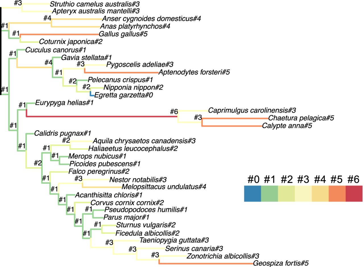 An example tree illustrating the grouping of branches according their beak shape morphological rates. The marked topology was then used as input for branch model in PAML (codeml for coding DNA and baseml for noncoding DNA). The maximum number of bins is eight for the coding gene set and 16 for the avian-specific highly conserved elements (ASHCE) set. Here, as an example, a binning with seven bins (#0 to #6) is shown.
