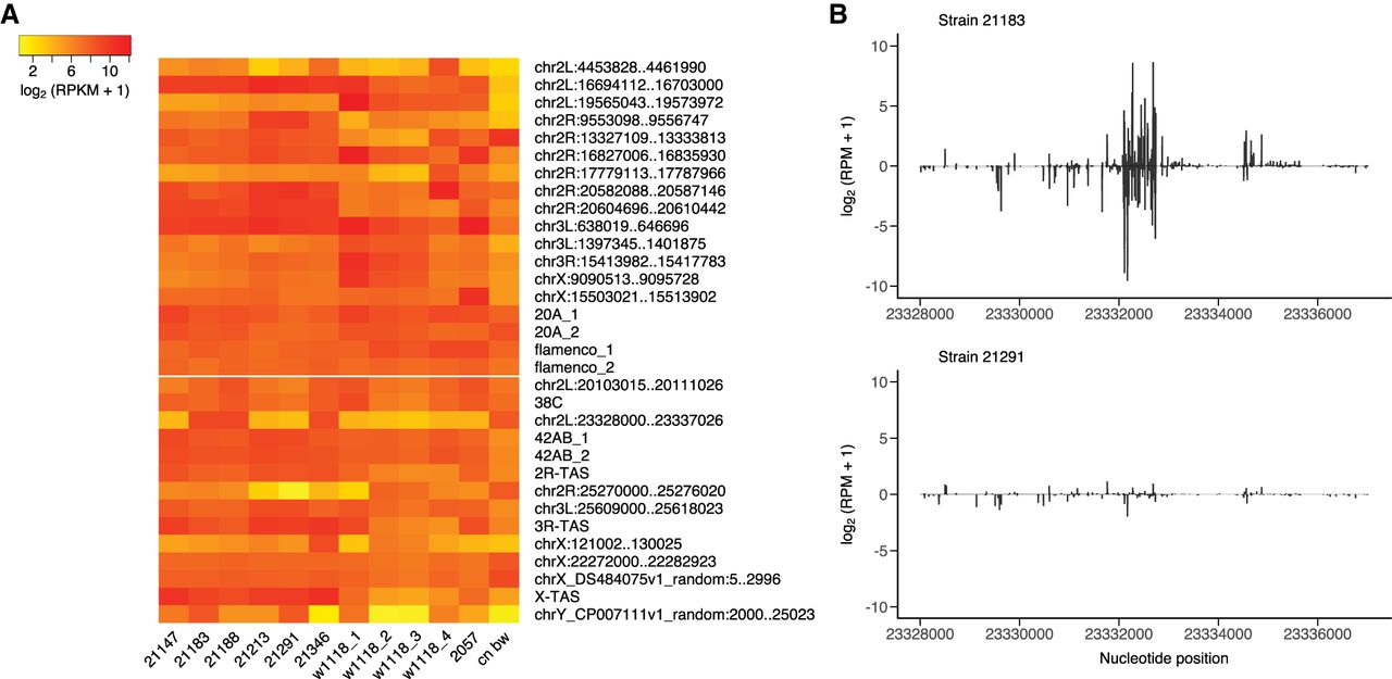 piRNA cluster annotation in P-element free strains. (A) Activity of 32 piRNA clusters in ancestral (P-element free) strains of D. melanogaster. Each column represents a small-RNA sequencing library (biological replicates are combined), and each row represents a piRNA cluster annotated in at least one of these libraries. Coordinates of piRNA clusters are based on the D. melanogaster release 6 assembly (dm6) (Hoskins et al. 2015). piRNA cluster expression levels are estimated by reads per kilo base per million mapped reads (RPKM) and transformed to log2 scale [log2 (RPKM + 1)]. Clusters above the white line are unistrand piRNA clusters, and those below the white line are dual-strand piRNA clusters. Details on small-RNA library prep, which may be related to differences in annotated piRNA clusters between libraries from w1118, are provided in Supplemental Table S1. (B) An example of a polymorphism in piRNA cluster activity in an annotated cluster on Chromosome 2L (23,328,000–23,337,026). Abundant piRNAs are detected from strain 21183, whereas strain 21291 produces few piRNAs. Only uniquely mapping piRNAs are considered. piRNA density is measured in reads per million mapped reads (RPM) and transformed to log2 scale [log2 (RPM + 1)]. Positive values represent piRNAs mapped to sense strand of the reference genome, and negative values represent piRNAs from antisense strand.