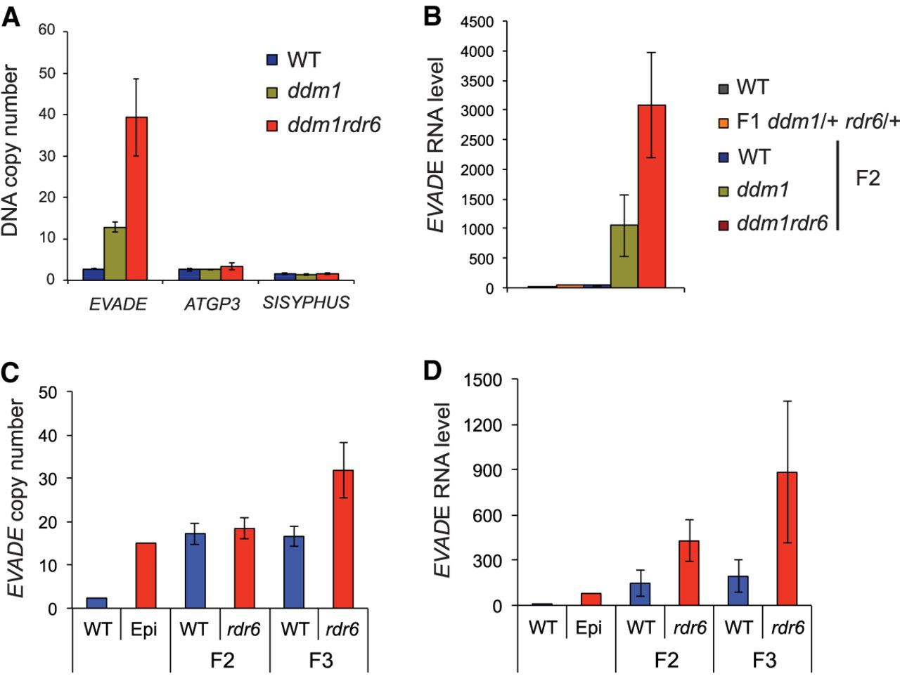 DNA and RNA levels of LTR retrotransposons in ddm1 and rdr6 mutants. (A) DNA copy numbers of EVADE, ATGP3, and SISYPHUS in ddm1 and ddm1rdr6 were normalized with a single copy gene (AT5G13440). (B) RT-qPCR data of EVADE elements using POL primers; y-axis indicates relative levels of EVADE genomic RNA to WT after normalization to ACT2. (C,D) EVADE DNA copy number and genomic RNA levels were analyzed in F2 and F3 progenies of F1 plants carrying active EVADE epigenetically inherited from parental rdr6/+ (Epi) crossed with WT pollen. Error bars, SD (n = 3).