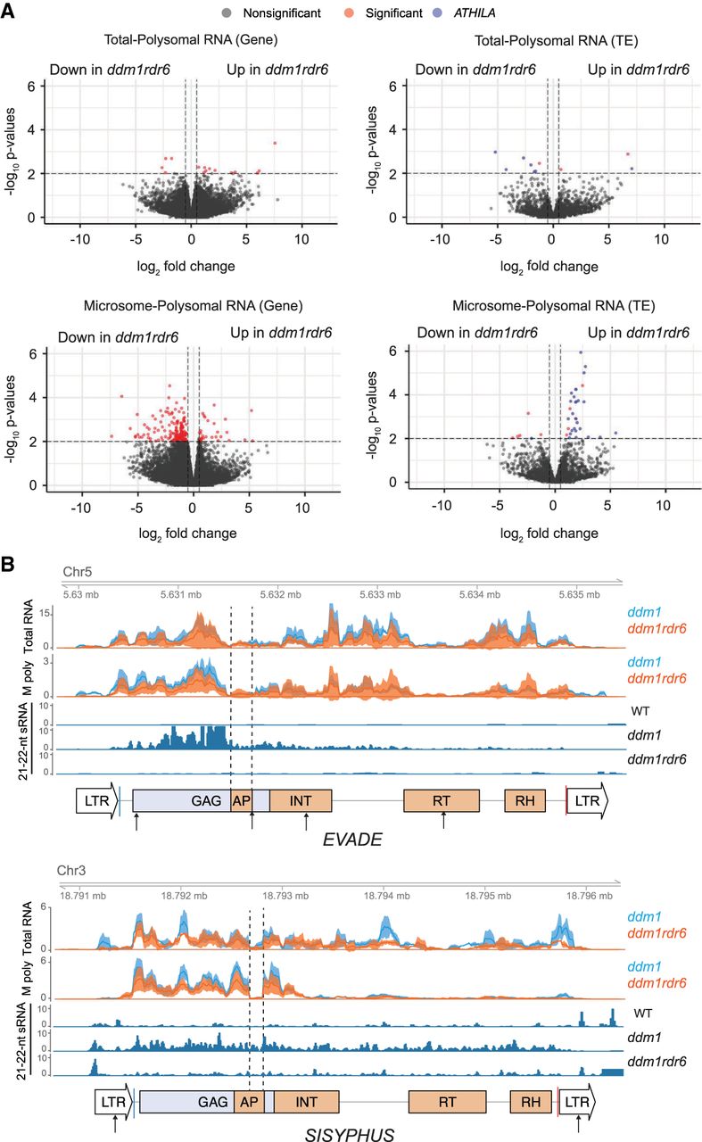 Translatome profiles of ddm1 and ddm1rdr6. (A) Differential analysis of polysomal RNA-seq data between ddm1 and ddm1rdr6. Polysomal RNA-seq values were normalized by total RNA seq values to reflect polysomal enrichment (Methods). Red dots indicate significantly regulated genes or transposable elements (TEs) by cut-off values of |log2(fold-change)| > 0.5 and P-values < 0.01 which include ARF4 as an internal control. Significantly regulated ATHILA family elements are labeled with blue dots. (B) Total RNA and microsome-polysomal RNA (M poly) levels are shown for EVADE (AT5TE20395) and SISYPHUS (AT3TE76225). Mean RPM mapped reads and 95% confidence intervals of three biological replicates are shown for ddm1 (blue) and ddm1rdr6 (orange). Conserved protein domains, PBS and PPT, small RNA profiles, and miRNA target sites are indicated as in Figure 1.