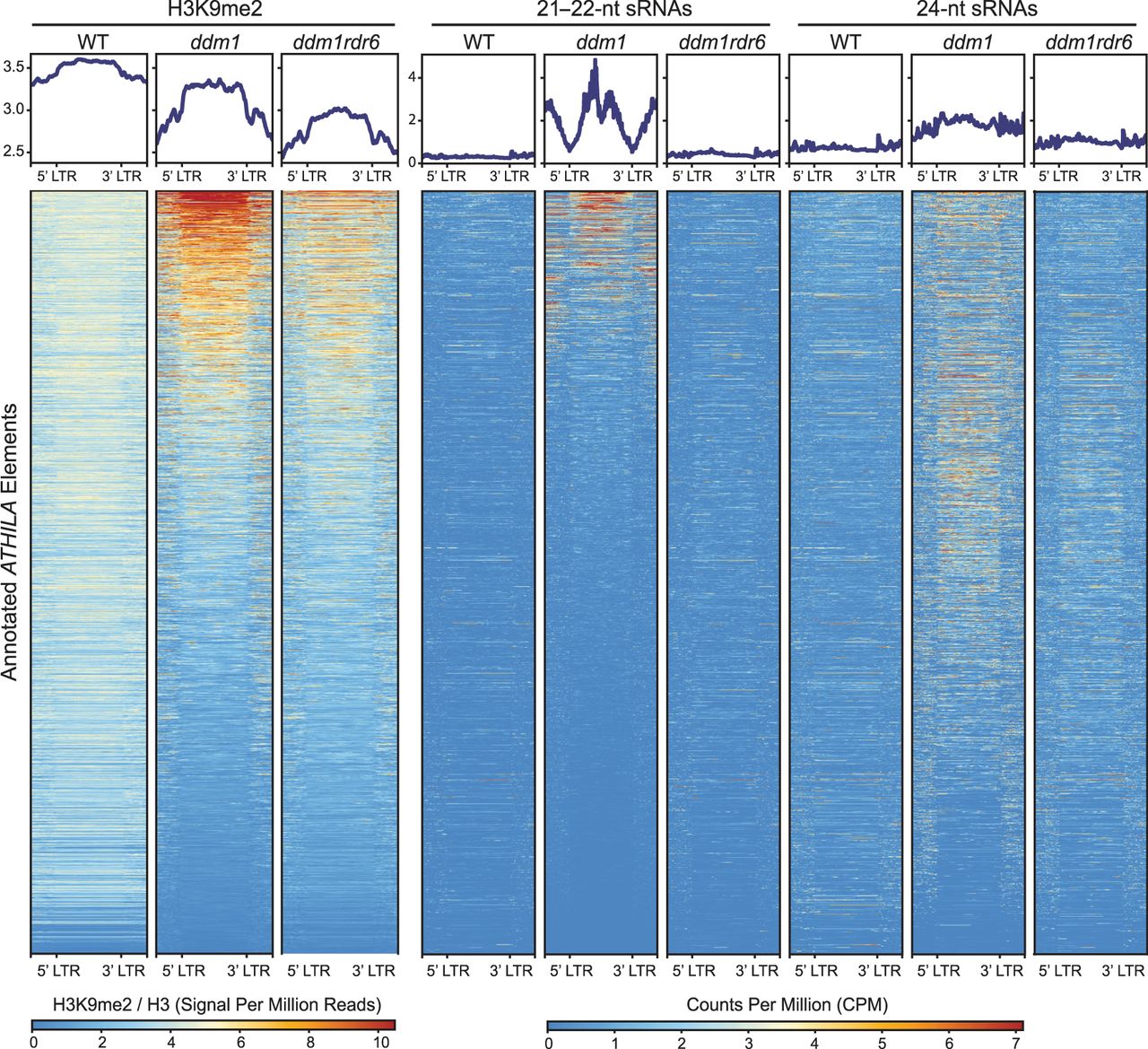 ATHILA family elements gain RDR6-dependent H3K9me2 in ddm1. H3K9me2 signal at transposable elements from multiple ATHILA families was analyzed in WT, ddm1, and ddm1rdr6 genotypes and correlated with previously published small RNA data (Creasey et al. 2014). RDR6-dependent gains in H3K9me2 colocalize with increased 21- to 22-nt siRNAs in ddm1. Plots depict transposable elements annotations scaled to 5 kb, as well as 2 kb upstream of and downstream from each feature. H3K9me2 ChIP data were normalized by H3, and small RNA data were normalized by counts per million.