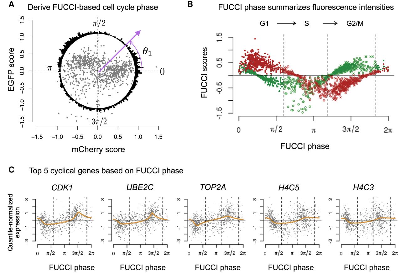 Characterizing cell cycle phase using FUCCI fluorescence intensities. (A) We inferred FUCCI phase (angles in a circle) based on EGFP and mCherry scores. The points in center correspond to the 888 quality single-cell samples. The circle histogram shows the FUCCI phase distribution corresponding to the EGFP (y-axis) and mCherry (x-axis) scores. For example, we inferred θ1 based on the cell's FUCCI scores, namely, inverse tangent function of (EGFP/mCherry). (B) We ordered FUCCI scores of EGFP and mCherry by FUCCI phase to visualize the co-oscillation of EGFP and mCherry along the cell cycle. Red and green points correspond to EGFP and mCherry scores, respectively. The vertical lines correspond to phase boundaries derived from the PAM-based classification (G1, 384 cells; S, 172 cells; G2/M, 332 cells). (C) Given the FUCCI phase, we ordered cells along the cell cycle to estimate the cyclic trend of gene expression levels for each gene. We identified these five genes as the top five cyclic genes in the data: CDK1, UBE2C, TOP2A, H4C5, and H4C3. Each plot shows the expression levels of 888 single-cell samples and the estimated cyclic trend (orange line). All five genes were previously identified as related to cell cycle regulation. The vertical lines correspond to phase boundaries derived from the PAM-based classification.