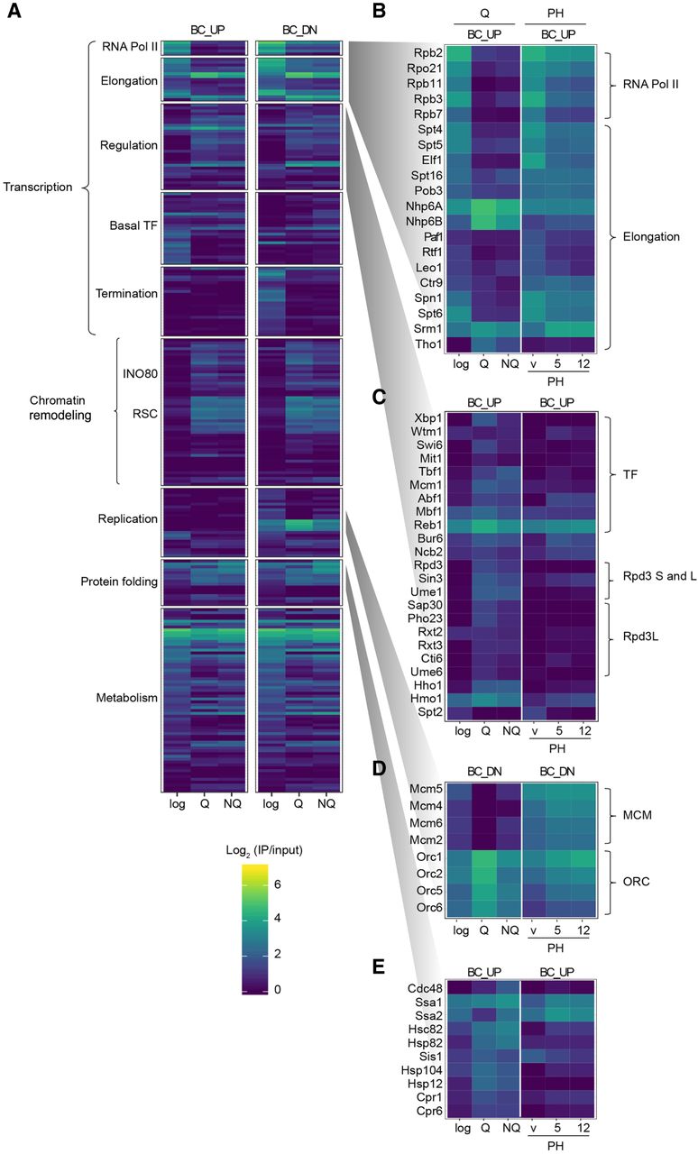 Chromatin-proteome rewiring upon transcriptional repression in quiescence. (A) Heatmap of the HO Epi-Decoder binding scores in mid-log, Q, and NQ cells (mean IP/input of three biological replicates). For mean binding scores of all proteins examined in the Chrom-3×BC library, see Supplemental Table S3. Proteins were manually clustered and ranked in functional subcategories as in Figure 2C. (B–E) Zoom-in of heatmap of panel A (promoter region BC_UP, except replication for which terminator BC_DN next to the origin of replication was used) showing proteins in the indicated annotated clusters. PH treatment during G1 arrest (vehicle, 5 and 12 min) is shown for comparison.