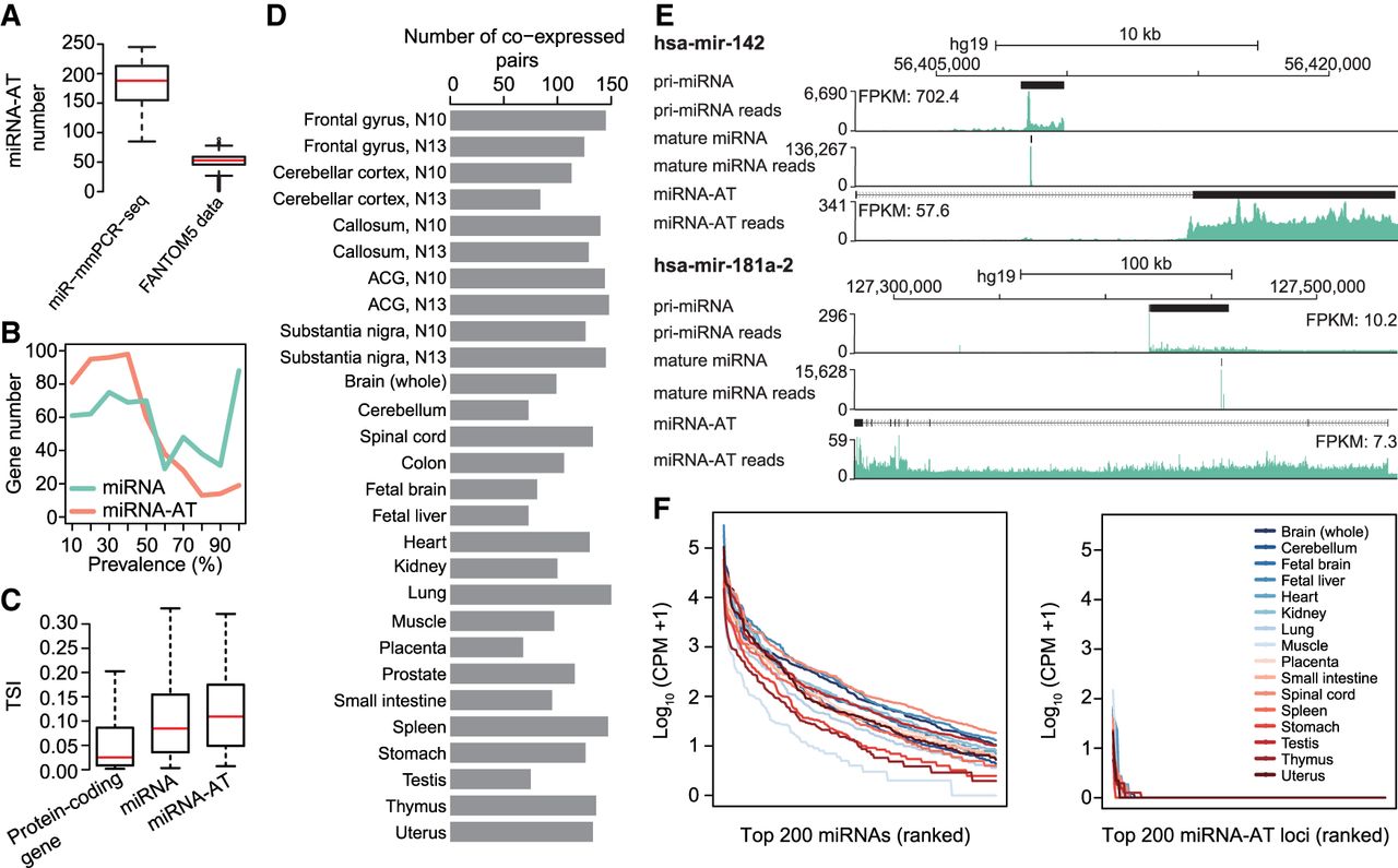 The characterization of miRNA-ATs. (A) Comparison of the number of miRNA-ATs detected using miR-mmPCR-seq data sets or FANTOM5 data sets. In miR-mmPCR-seq data sets, a miRNA-AT was defined as transcribed if it has at least 50 reads covered and one A-to-I editing site with editing levels ≥2%. Liver and bone marrow were excluded because fewer than 260 loci were amplified in these two tissues. In the FANTOM5 data sets, a miRNA-AT was defined as expressed if it has at least 10 reads covered in the CAGE data. The numbers of miRNA-ATs that were present in the FANTOM5 transcript atlas and expressed in each of the 1897 FANTOM5 samples were shown. (B) Prevalence of the expression of miRNA-ATs or miRNAs across different human tissue types. Prevalence of a miRNA-AT or miRNA is defined as the percentage of tissues with the miRNA-AT or miRNA expressed. A miRNA-AT or miRNA was defined as transcribed if it has at least 50 reads covered and one A-to-I editing site with editing levels ≥2%. The numbers of miRNA-ATs or miRNAs were shown in the y-axis. (C) Tissue specificity comparison between protein-coding genes, miRNAs, and miRNA-ATs using FANTOM5 data. The tissue specificity index (TSI) was used. TSI varies from 0 to 1, where 0 means broadly expressed, and 1 is specific. To avoid the confounding effect of protein-coding genes, miRNAs and miRNA-ATs that are overlapped with protein-coding genes were excluded from this analysis. Moreover, we required that genes were with counts per million (CPM) ≥1 in at least one FANTOM5 sample. (D) The number of coexpressed sense–antisense miRNA pairs inferred from coediting data in each sample. A sense–antisense miRNA pair was defined as coexpressed if both have edited sites (≥2%) detected in a given sample. The same samples as in A were used for analysis. (E) UCSC Genome Browser view of two miRNA loci. The genomic features and stranded mRNA-seq and small RNA-seq read coverages of the sense–antisense miRNA pairs were shown from top to bottom: (1) the annotation of the full-length pri-miRNA from FANTOM5, (2) the read coverage of the pri-miRNA calculated using stranded mRNA-seq, (3) the annotation of the mature miRNA, (4) the read coverage of the mature miRNA, (5) the annotation of the full-length miRNA-AT from FANTOM5, (6) the read coverage of the miRNA-AT calculated using stranded mRNA-seq. Stranded mRNA-seq of nuclear RNA and small RNA-seq of total cell RNA of GM12878 cells from the ENCODE Project were used for analysis. (F) Expression levels of mature miRNAs or putative mature miRNAs processed from miRNA-ATs. The top 200 genes were shown.