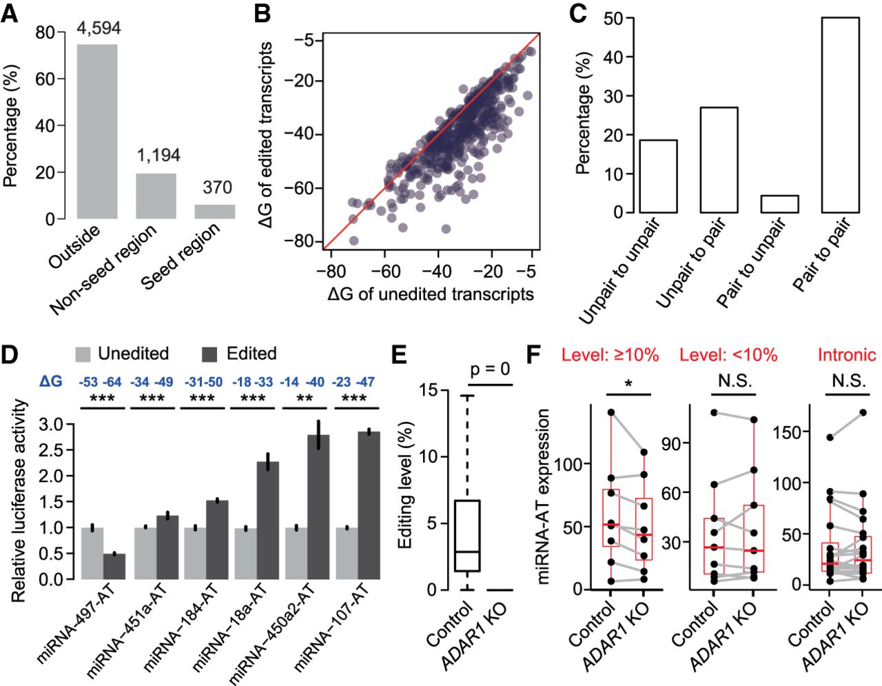 RNA editing modulates miRNA-mediated regulation of miRNA-ATs. (A) The percentage of miRNA-AT editing sites that occur in the positions opposite to the sense miRNAs. (Outside) Outside of the region opposite to the mature miRNA. The number of editing sites is indicated above the bar. miRNA-ATs with their intronic regions targeted by the paired sense-mature miRNAs were excluded. (B) Comparison of the free energy (ΔG) between unedited and edited regions of miRNA-ATs that are opposite to the paired pre-miRNAs. For a miRNA-AT with multiple editing sites, a fully edited form was considered. miRNA-ATs with their intronic regions targeted by the paired sense-mature miRNAs were excluded. (C) The proportion of editing sites with different types of pairing patterns before and after editing. For each editing site, we predicted the secondary structure of the miRNA-ATs before and after editing and compared the pairing patterns of this site. (D) Dual-luciferase reporter assays to compare the effect of sense miRNAs on unedited and edited forms of miRNA-ATs. For each miRNA-AT, the predicted RNA secondary structures of unedited and edited versions were shown in Supplemental Figure S11. (Relative activity) Average Renilla luciferase activity normalized to firefly luciferase in four biological replicates; (error bars) SD based on four biological replicates. P-values were calculated using student's t-test. (E) Editing level comparison between control and ADAR1 knockout HEK293 cells. All known human editing sites obtained from RADAR database version 2 were used for analysis. Sites that were edited in control sample and covered by at least 30 reads in both samples were selected. P-values were calculated using paired Wilcoxon signed-rank test. (F) Comparison of miRNA-AT expression levels between control and ADAR1 knockout HEK293 cells. We required that miRNAs were expressed in HEK293 cells. P-values were calculated using the paired Wilcoxon signed-rank test. (Level ≥ 10%) The regions of miRNA-ATs that are opposite to pre-miRNAs are located in the exonic regions and have at least one site with editing level ≥ 10%; (level < 10%) control set 1, the regions of miRNA-ATs that are opposite to pre-miRNAs are located in the exonic regions and have all sites with editing level < 10%; (intronic) control set 2, the regions of miRNA-ATs that are opposite to pre-miRNAs are located in the intronic regions.