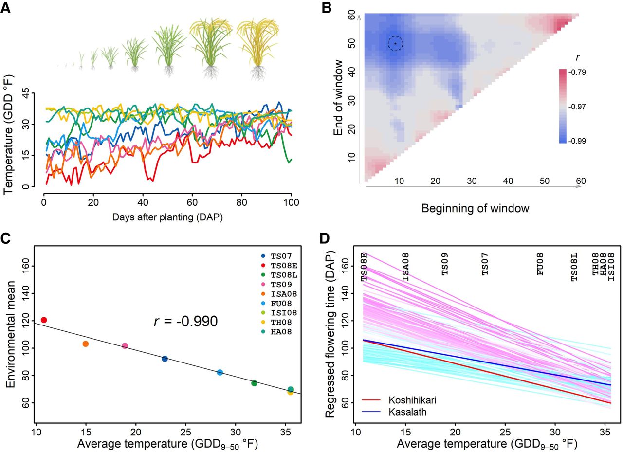 Identifying an environmental index from the performance data. (A) Rice development and temperature (in GDD) profiles across different environments. (B) Search for the most indicative growth window within which average temperature is highly correlated to environmental mean of flowering time. Temperature within the window of 9–50 DAP was chosen as the environmental index and denoted as GDD9–50. (C) Significant correlation between GDD9–50 and environmental mean. (D) Regression-fitted reaction norm using the environmental index (GDD9–50) as the explanatory variable.