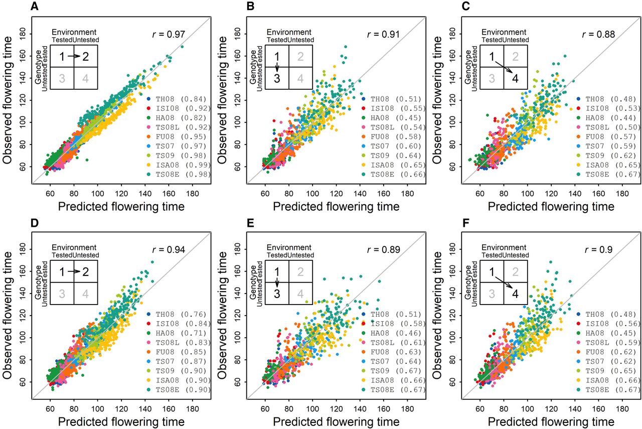 Performance prediction of flowering time with joint genomic regression analysis (JGRA) to leverage environmental index and genomic prediction. (A–C) JGRA using reaction-norm parameters. (D–F) JGRA using genome-wide marker effect continua. The three scenarios are predicting performance for tested genotypes in untested environments (A,D), predicting performance for untested genotypes in tested environments (B,E), and predicting performance for untested genotypes in untested environments (C,F). Prediction accuracy within each individual environment (in parentheses) and across all environments (r) are indicated; the diagonal line indicates the exact match between observed and predicted values.