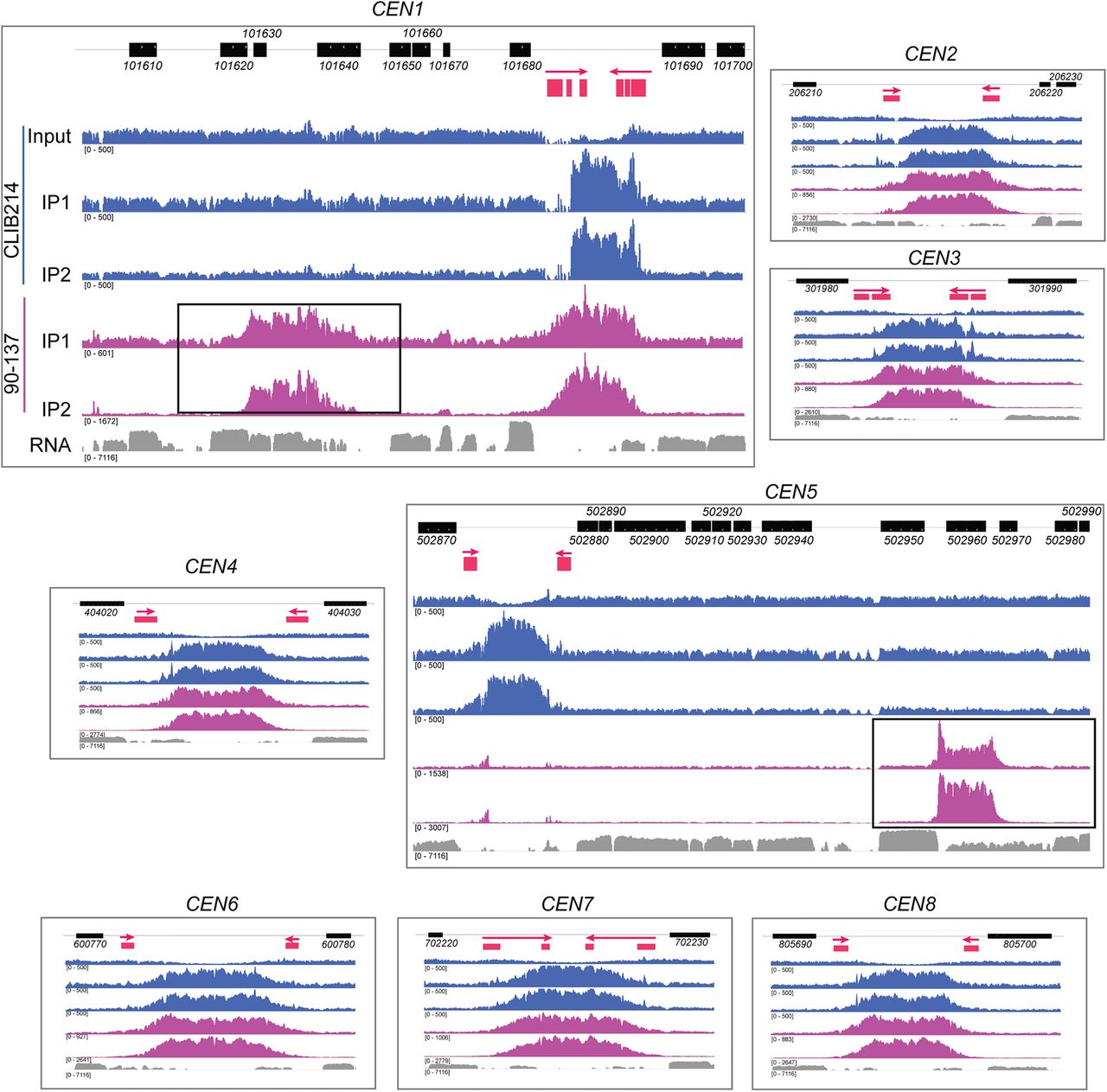 Natural polymorphisms for centromere location in C. parapsilosis. The ChIP-seq data from Figure 1D is shown in more detail, and the neocentromeres are highlighted with black boxes. The order of the tracks is the same in each panel but is labeled for CEN1 only. The top track shows the location of C. parapsilosis protein coding genes. The second track shows the IR sequences only (red), with an arrow indicating the direction of the repeat. The extent of the regions conserved between chromosomes is not shown. ChIP-seq read coverage is plotted in blue for C. parapsilosis CLIB214 and in purple for C. parapsilosis 90-137. Two independent immunoprecipitation experiments were performed per strain (IP1 and IP2). Only one control is shown; the total chromatin from C. parapsilosis CLIB214 (input). The equivalent data for C. parapsilosis 90-137, and for an experiment with no tagged Cse4, are available at GEO, accession number GSE136854. The bottom track (gray) shows gene expression measured by RNA-seq during growth in YPD (taken from SRR6458364 from Turner et al. 2018). The read depth scale is indicated in brackets; the total number of reads varied in each experiment. The maximum scale for C. parapsilosis CLIB214 is restricted to 500 to reduce the signal from the rDNA. The RNA expression data are plotted on a log scale. The apparent dips in coverage at the centromeres in the input data are likely to be an artifact of the mapping procedure because reads that map to more than one site in the genome were discarded. Some reads are also incorrectly mapped to nonidentical repeat sequences, resulting in a small Cse4 signal at CEN5 in 90-137. All data are visualized using IGV.