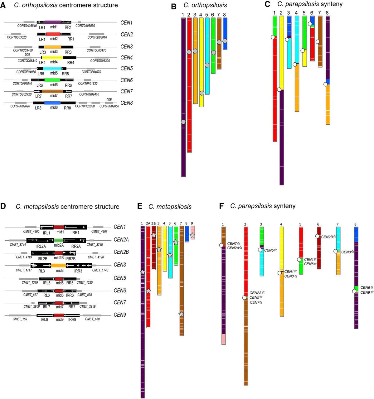 Identification of centromeres and centromere-proximal rearrangements in C. orthopsilosis and C. metapsilosis. (A) Cartoon of centromere structure in C. orthopsilosis 90-125 (Lombardi et al. 2019b). All mid regions are unique and are shown in different colors. Sequences in black are conserved among chromosomes. IRs are shown with white arrows, and adjacent genes are shown with gray boxes. Putative transposases with DDE domains are indicated. More detail is provided in Supplemental Figure S2 and Supplemental Table S2. (B,C) Synteny relationship between C. parapsilosis and C. orthopsilosis. SynChro (Drillon et al. 2014) was used (delta value of two) to identify potential orthologs (reciprocal best hits [RBHs]), represented by colored lines in the two species, and to generate synteny maps. (B) Location of RBHs on C. orthopsilosis chromosomes. The approximate location of the putative centromeres is indicated with a gray polygon. (C) C. parapsilosis chromosomes, colored with respect to the RBH from C. orthopsilosis. The location of the C. parapsilosis centromeres are indicated with an offset white circle. The location of syntenic C. orthopsilosis centromeres is shown in more detail in Figure 5. (D) Cartoon of centromere structure in C. metapsilosis. Sequences in black are conserved among chromosomes. IRs are shown with white arrows, which are sometimes fragmented and overlapping. Mid-core regions from some CENs are similar in sequence (>60%) and are shown in the same color. Adjacent genes are shown with gray boxes. More detail is provided in Supplemental Figure S2 and Supplemental Table S2. (E,F) Synteny relationship between C. parapsilosis and C. metapsilosis. (E) Location of RBHs on C. metapsilosis chromosomes. The approximate location of the putative C. metapsilosis centromeres are indicated with a gray star (centromeres were not identified on scaffolds 4 and 8). (F) C. parapsilosis chromosomes, colored with respect to the RBH from C. metapsilosis. The location of the C. parapsilosis centromeres are indicated with a white circle. The approximate location of syntenic C. metapsilosis centromeres are shown by name and with gray stars. The same colors are used for C. orthopsilosis (B) and C. metapsilosis (E). This does not indicate that synteny is completely conserved between these species; it is a feature of SynChro, which carries out pairwise comparisons.