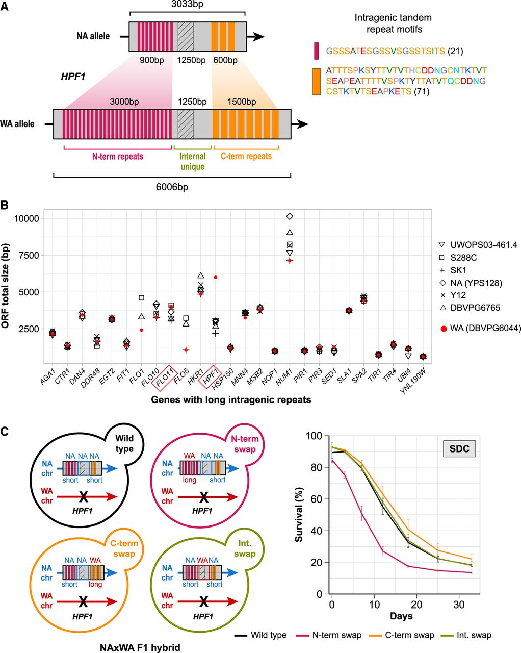 Massive intragenic tandem repeat expansions within HPF1 shorten life span. (A) Schematic representation of the intragenic repeats (colored rectangles) in HPF1 for NA and WA alleles. Hatched rectangle: a HPF1 internal unique region with high sequence variation between NA and WA alleles. Right: repeat motif units. Amino acids are colored according to the RasMol nomenclature. Numbers = motif size (amino acids). (B) Size variation of genes containing long intragenic repeats in seven diverged S. cerevisiae strains (Verstrepen et al. 2005; Yue et al. 2017). Diamonds: North American, red circles: West African. (C) Left panel: Design of allele swaps of HPF1 segments in the NA/WA F1 hybrid. The WA-HPF1 allele was deleted (black cross), while the NA-HPF1 was kept unchanged (wild type), or a segment was replaced by the corresponding WA-HPF1 segment. N-term: N-terminal repeats, C-term: C-terminal repeats, Int: internal unique region. Right panel: CLS for allele swapped constructs in SDC media.